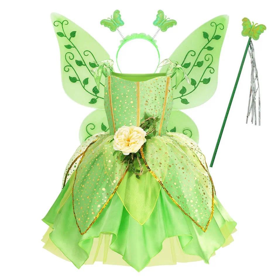 Baby Girl Tinkerbell Costume Kid Green Fairy Dress Fly Sleeve Leaf Modeling Gown Toddler Birthday Party Outfits