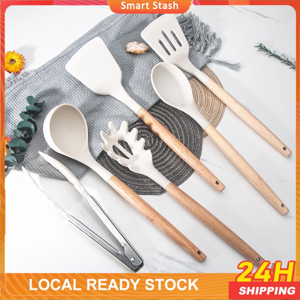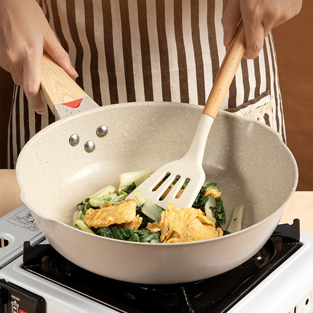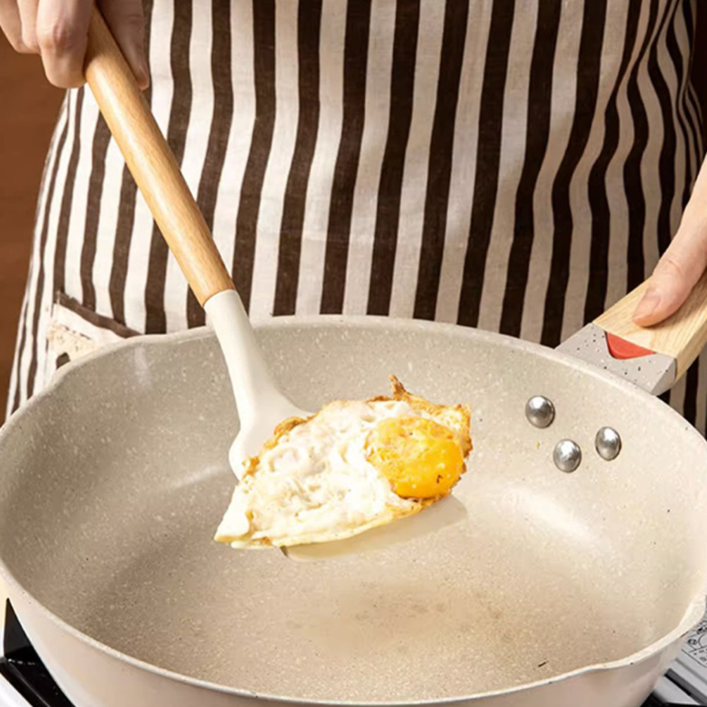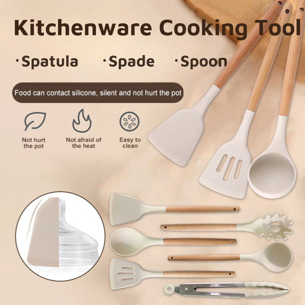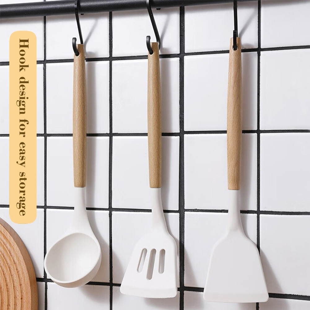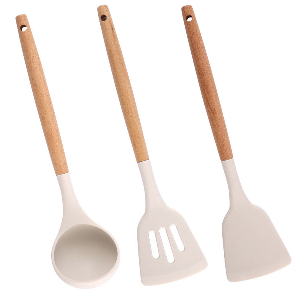 3PCS White Silicone Kitchenware Cooking Utensils Set Spatula Spoon Wooden Handle Non-Stick Spatula Cooking