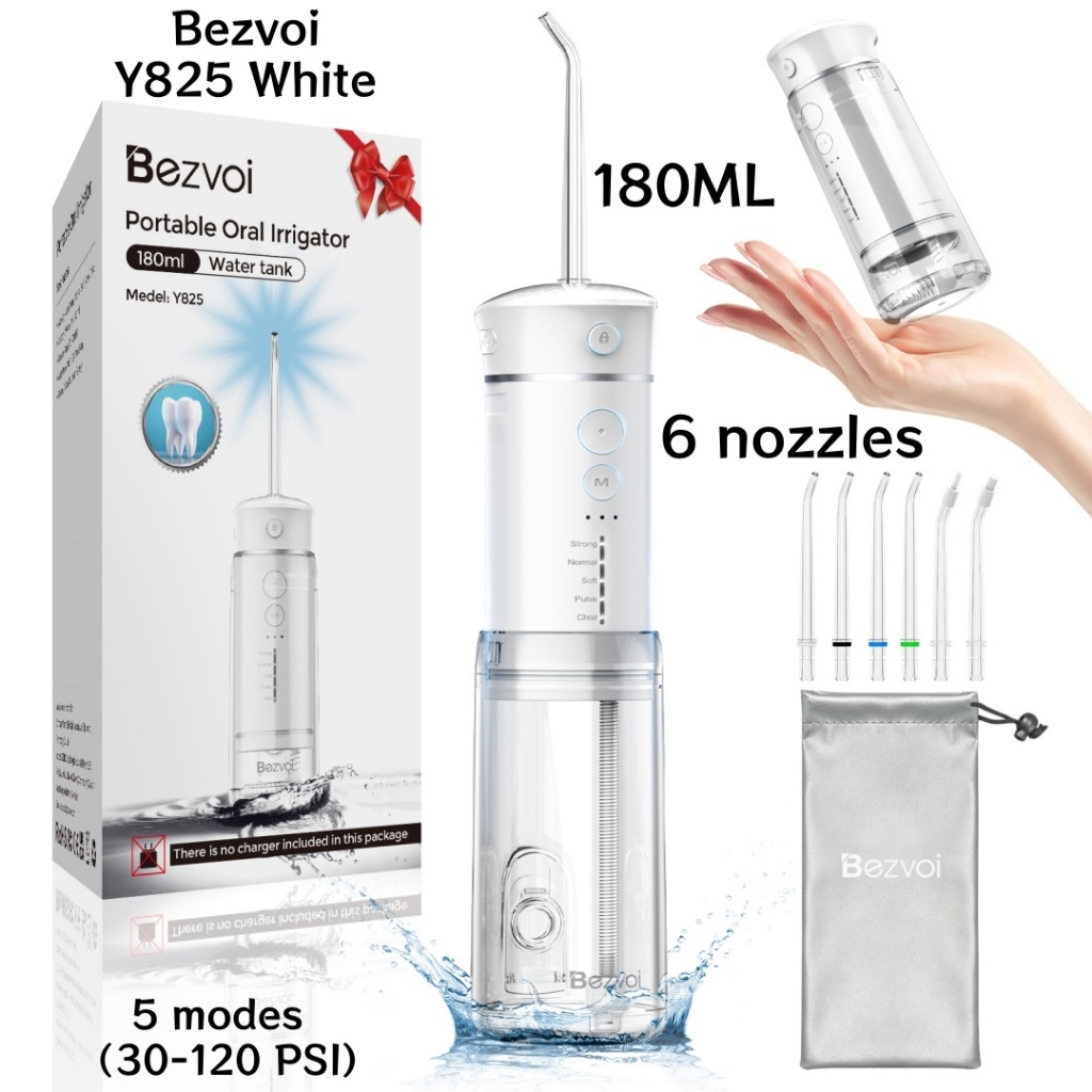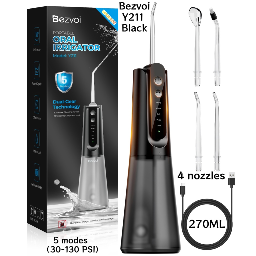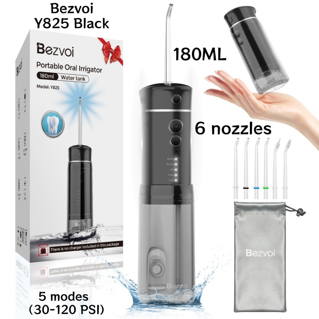 Bezvoi Y207 Black Water Flosser for Teeth Cordless: Oral Irrigator with 5 Modes, 300ML Water Tank IPX7 Waterproof Electric Tooth Cleaner, with 6 Tips nozzle Warranty 24 months
