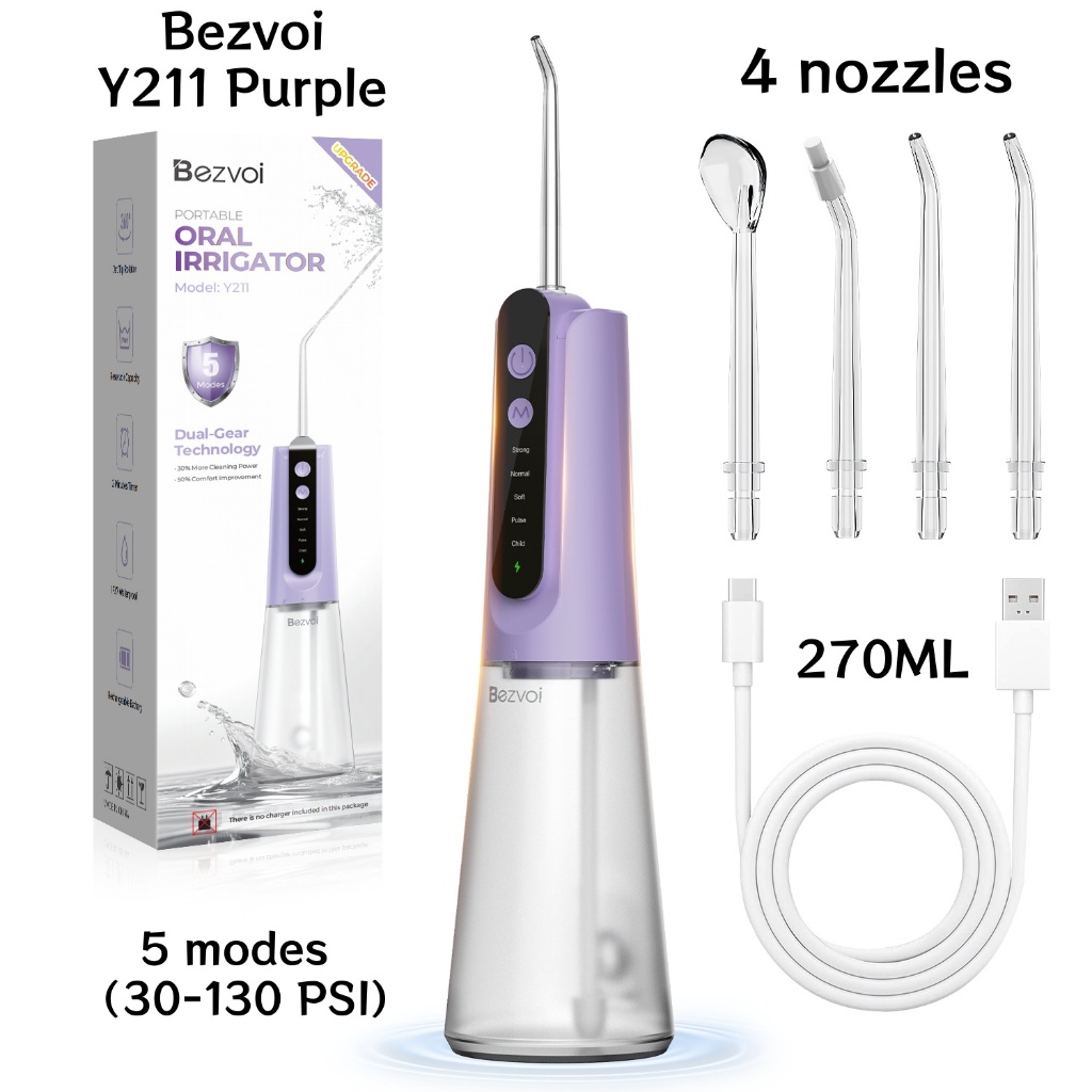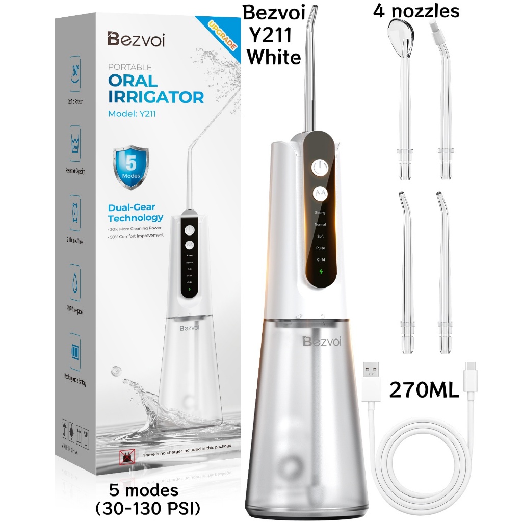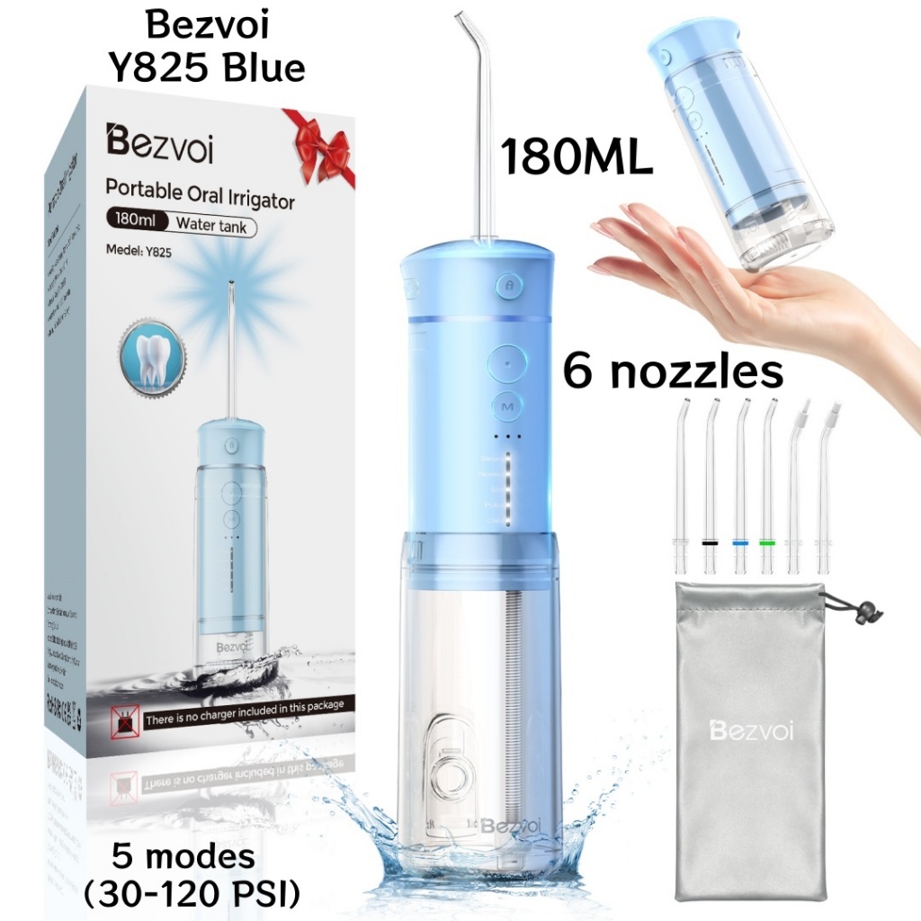 Bezvoi Y207 Black Water Flosser for Teeth Cordless: Oral Irrigator with 5 Modes, 300ML Water Tank IPX7 Waterproof Electric Tooth Cleaner, with 6 Tips nozzle Warranty 24 months