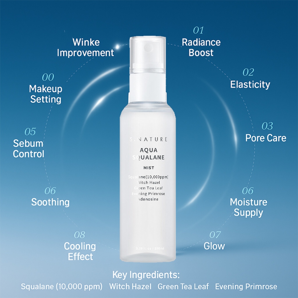 S.NATURE Aqua Squalane Mist 100ml / 50ml - Radiance Boost, Makeup Setting, Sebum Control