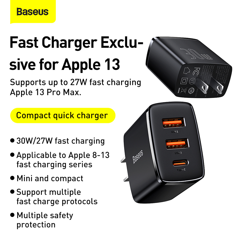 Baseus 30W Dual USB Type C Charger QC3.0 PD Quick Charge USB C Fast Charging Phone Charger