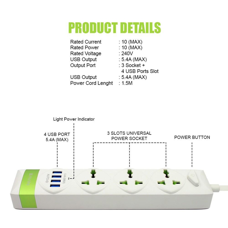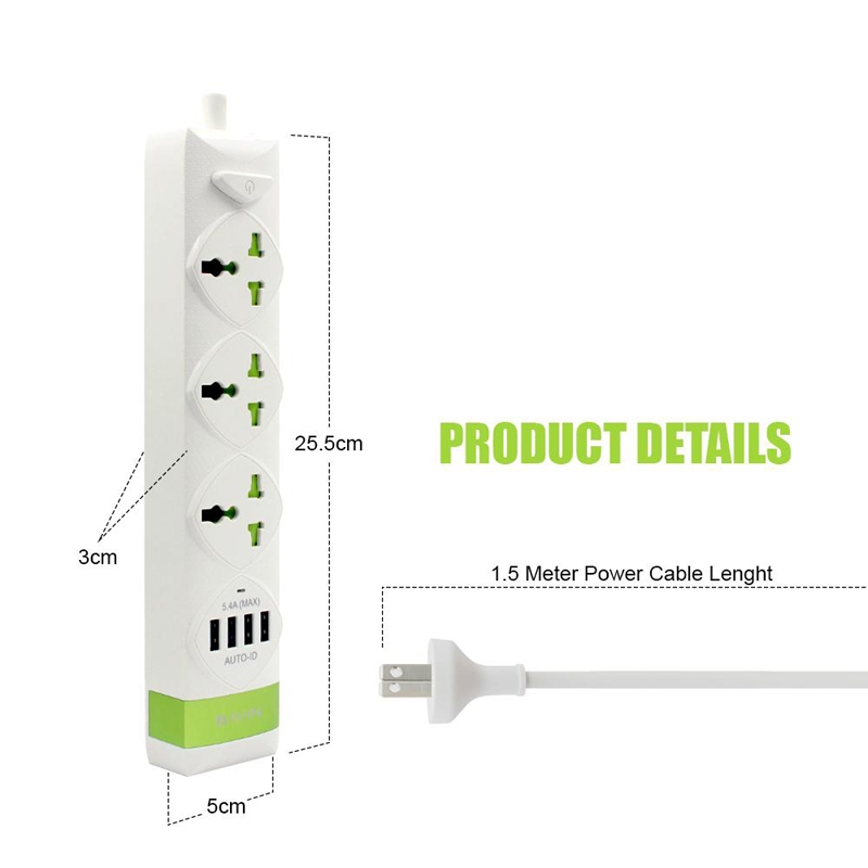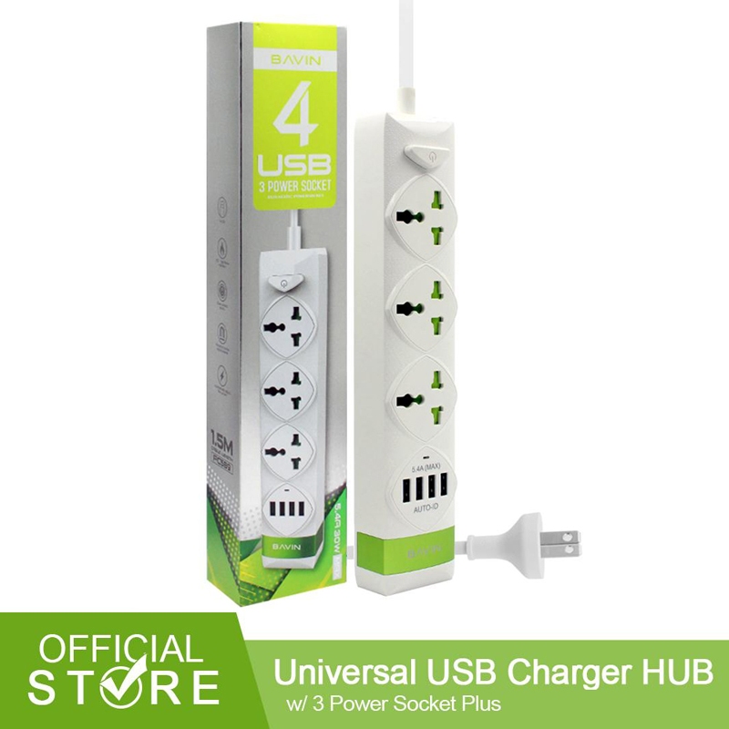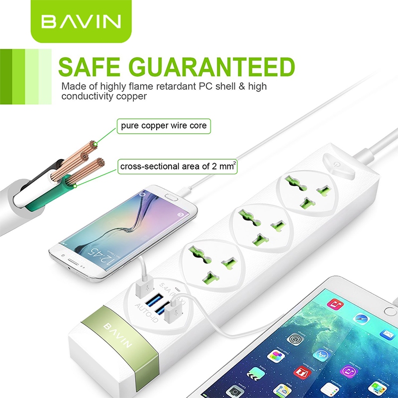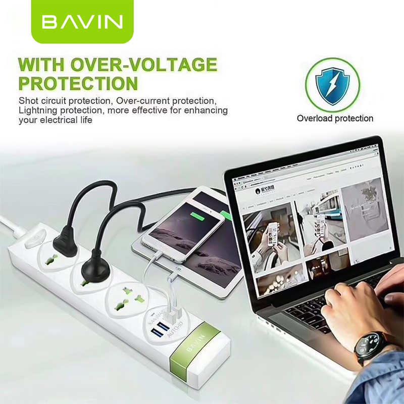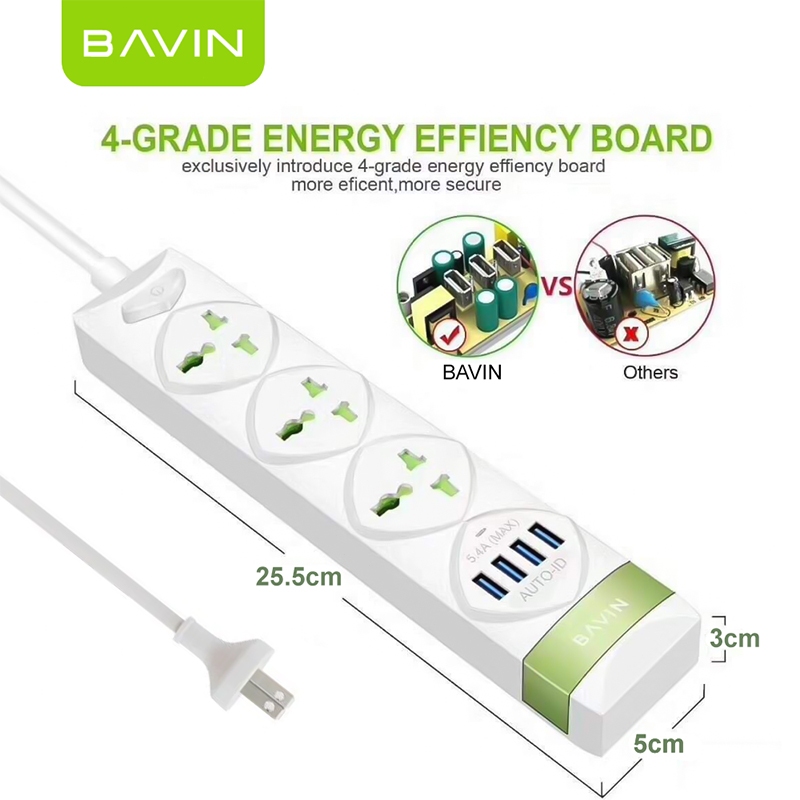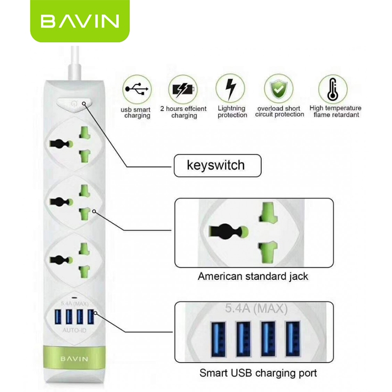 Bavin PC589 2500W Electrical Socket QC3.0 USB Fast Charging Extension Power Strip 4 USB Cord 1.5M