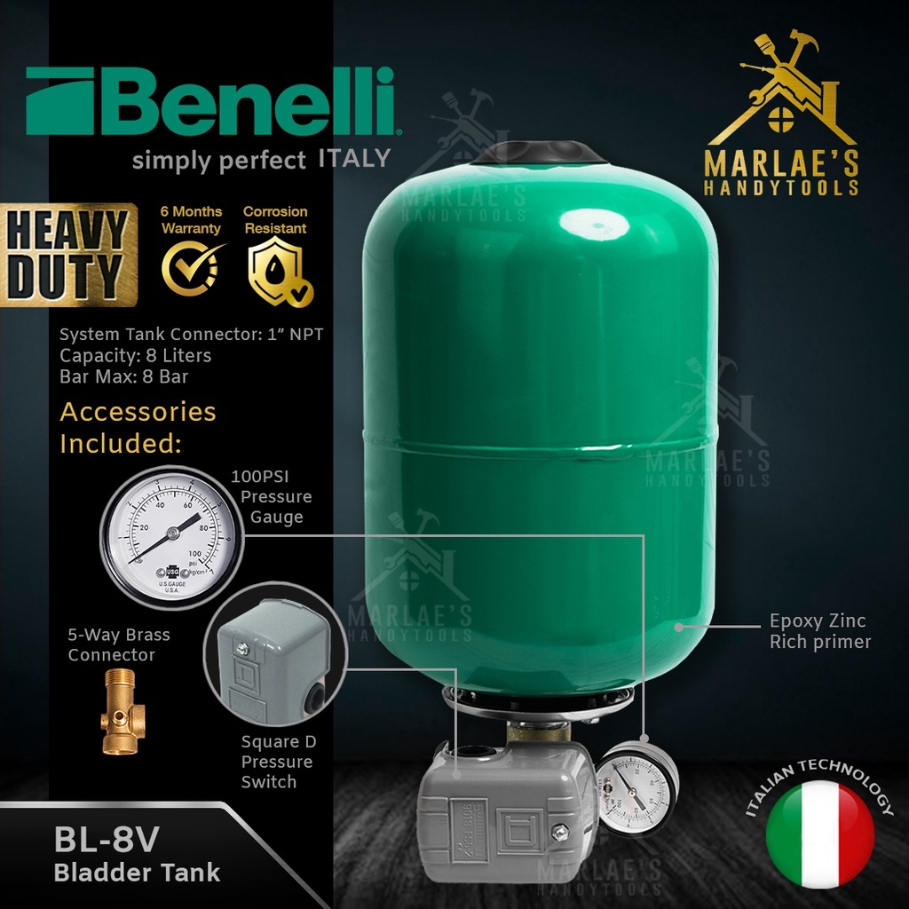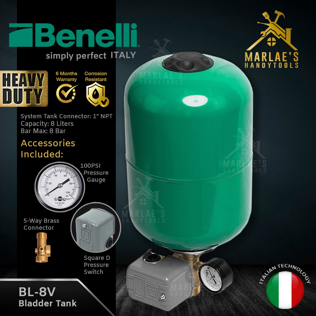 Benelli 8 Liters Bladder Tank with Pressure Switch, Gauge and Connector