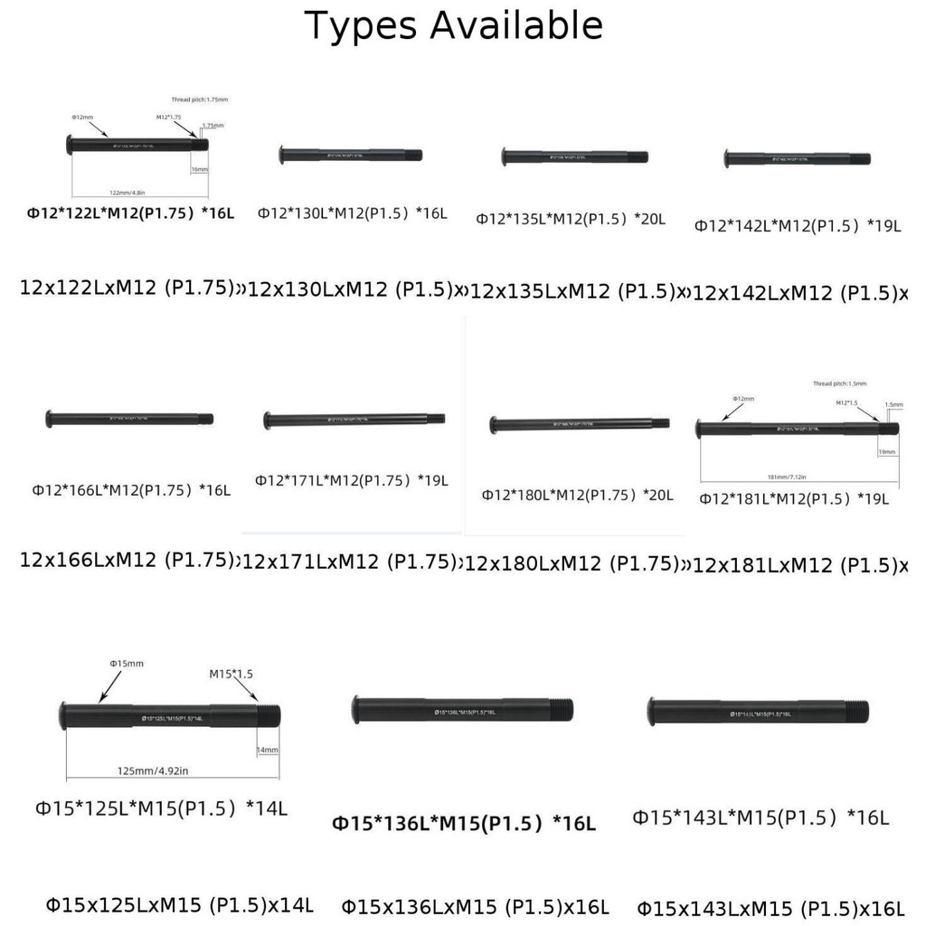 Bike Thru Axle Bicycle Replacement Front/Rear Thru Axle 12/15mm 122-181L P1.5/P1.75