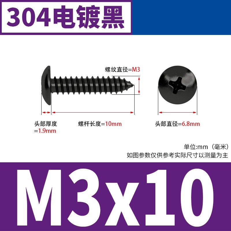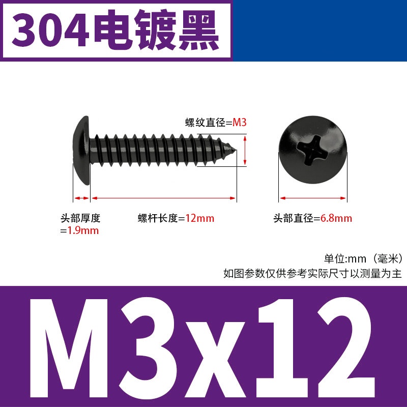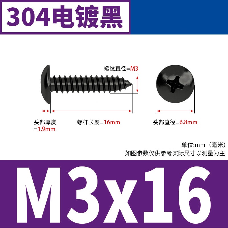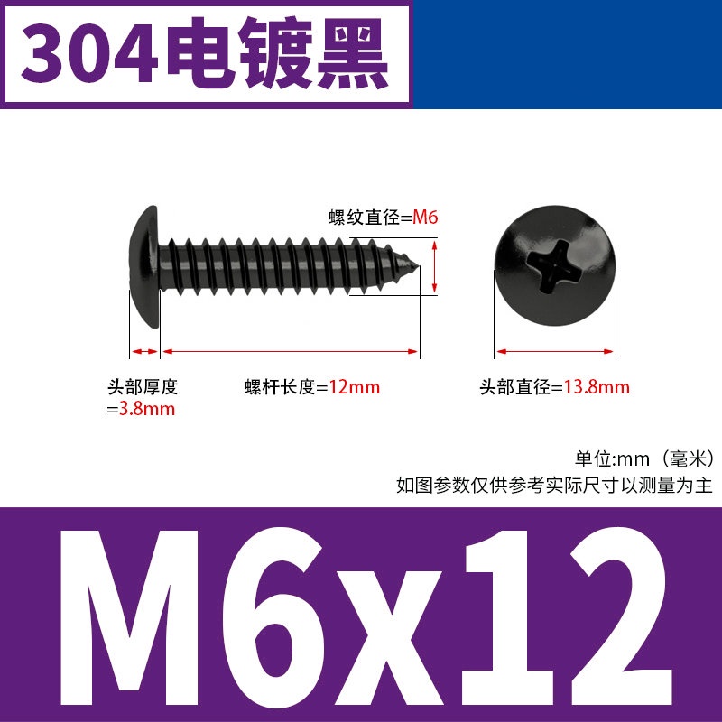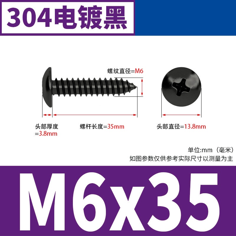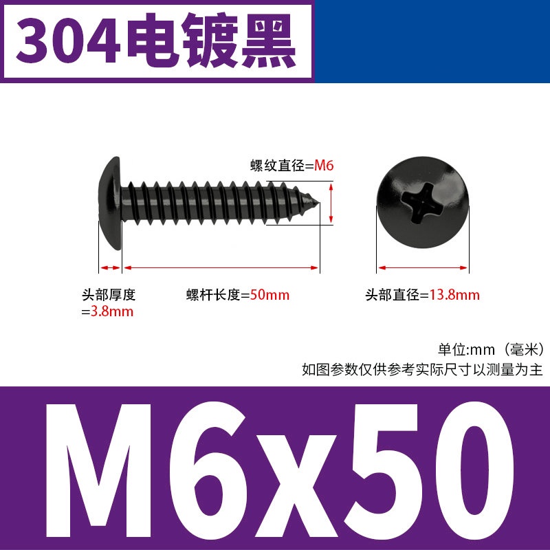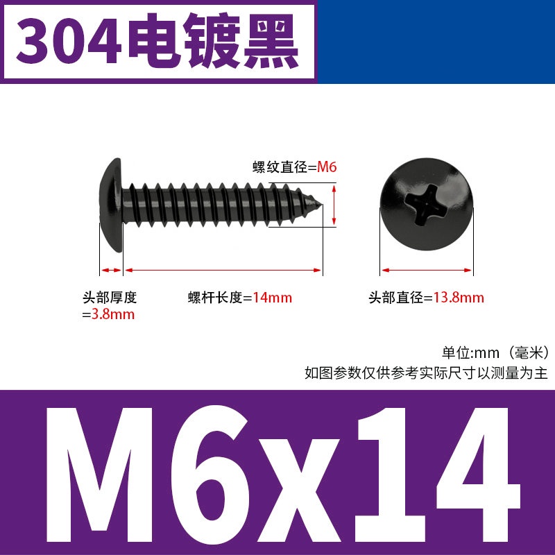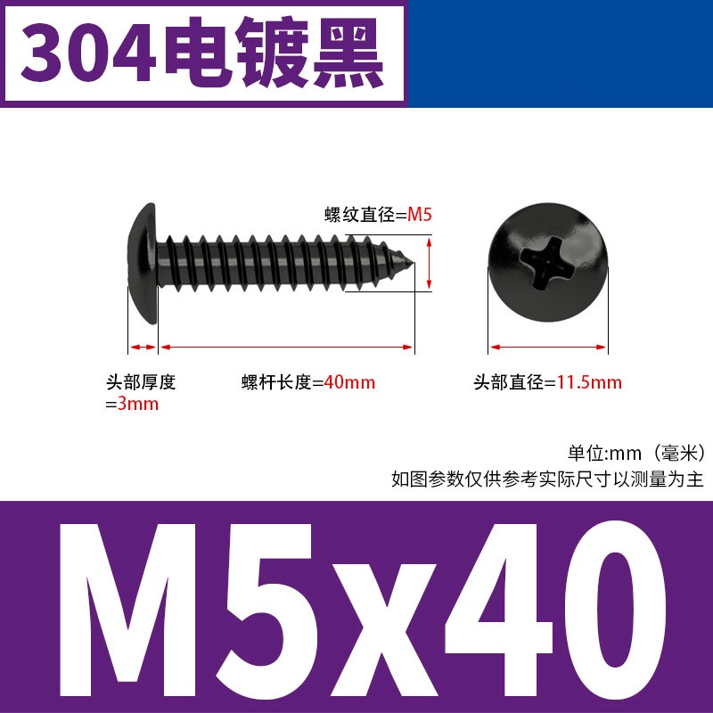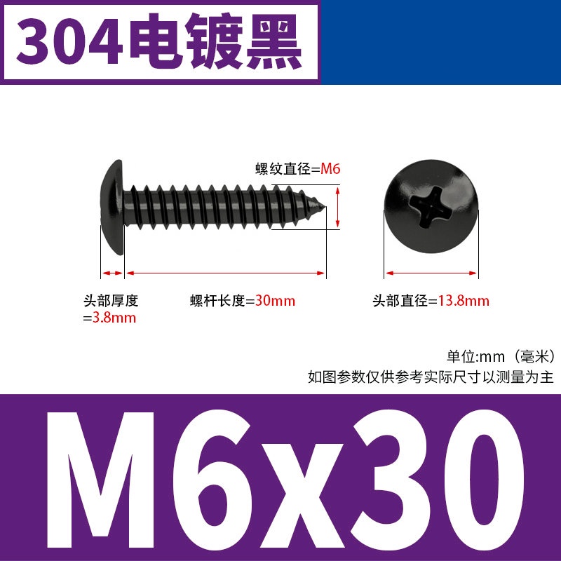 Black 304 Stainless Steel Large Flat Head Self-Tapping Screw M3-M4-M6 Umbrella Head Round Head Phillips Self-Tapping Screw