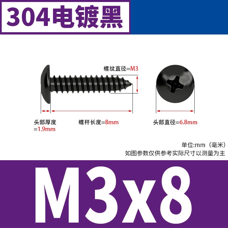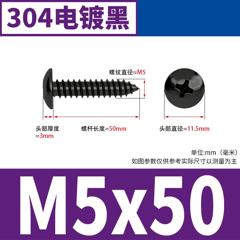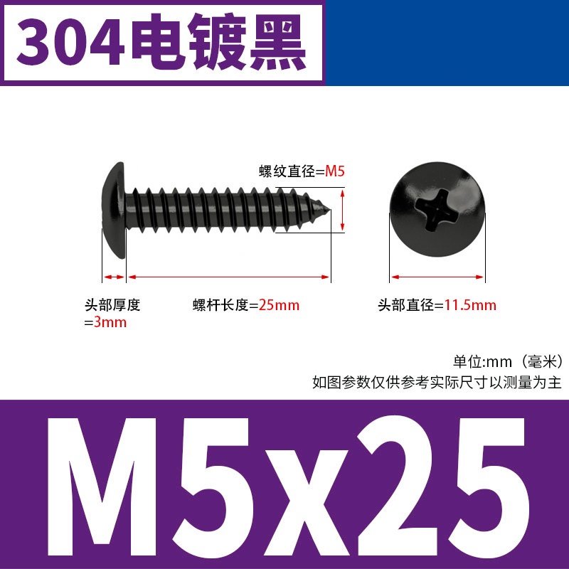 Black 304 Stainless Steel Large Flat Head Self-Tapping Screws Umbrella Head Round Head Phillips Self-Tapping Screws Wooden Screws M3