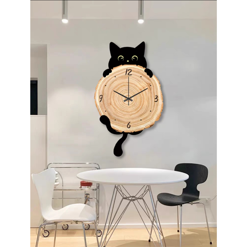 Black Cat Wall Clock Pendulum Swing Tail Wooden Glossy finish Decorative Clocks Home Decor