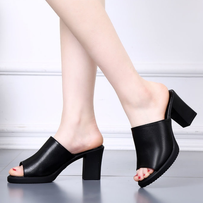 Black Chunky Heel Peep Toe Mules - Elegant Women's Summer Slide Sandals