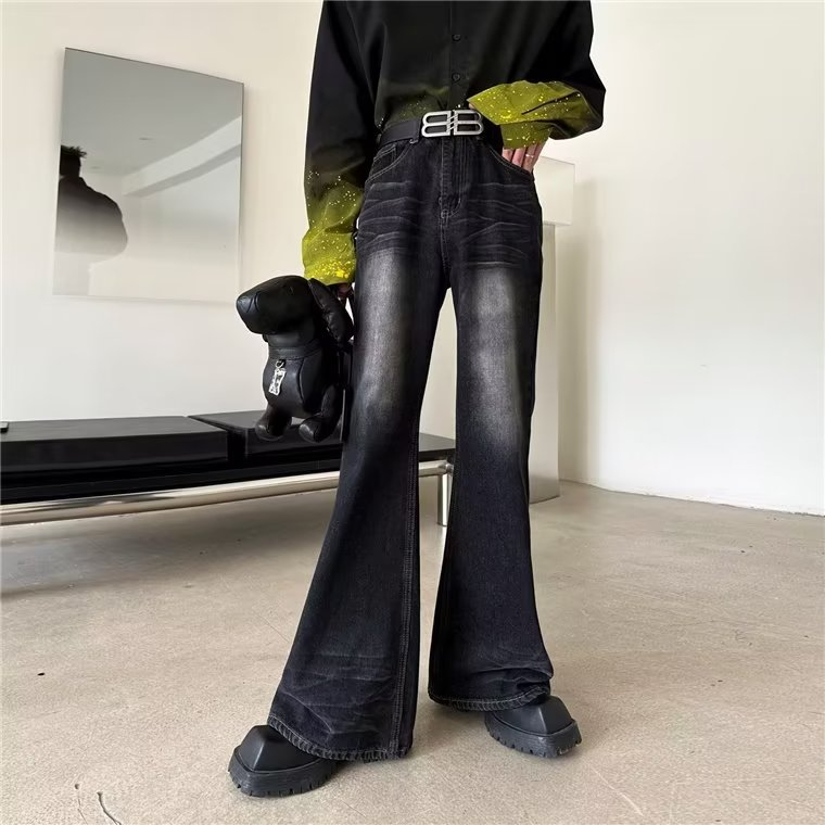 Black Micro-Flared Jeans Men S-3XL American Retro High Street Slimmer Look Straight-Leg Pants Men Casual All-Match Pants Men Trendy Gradient Loose Micro-Flared Pants Men Street Slimmer Look Leg Trimming Floor-Mopping Jeans Men