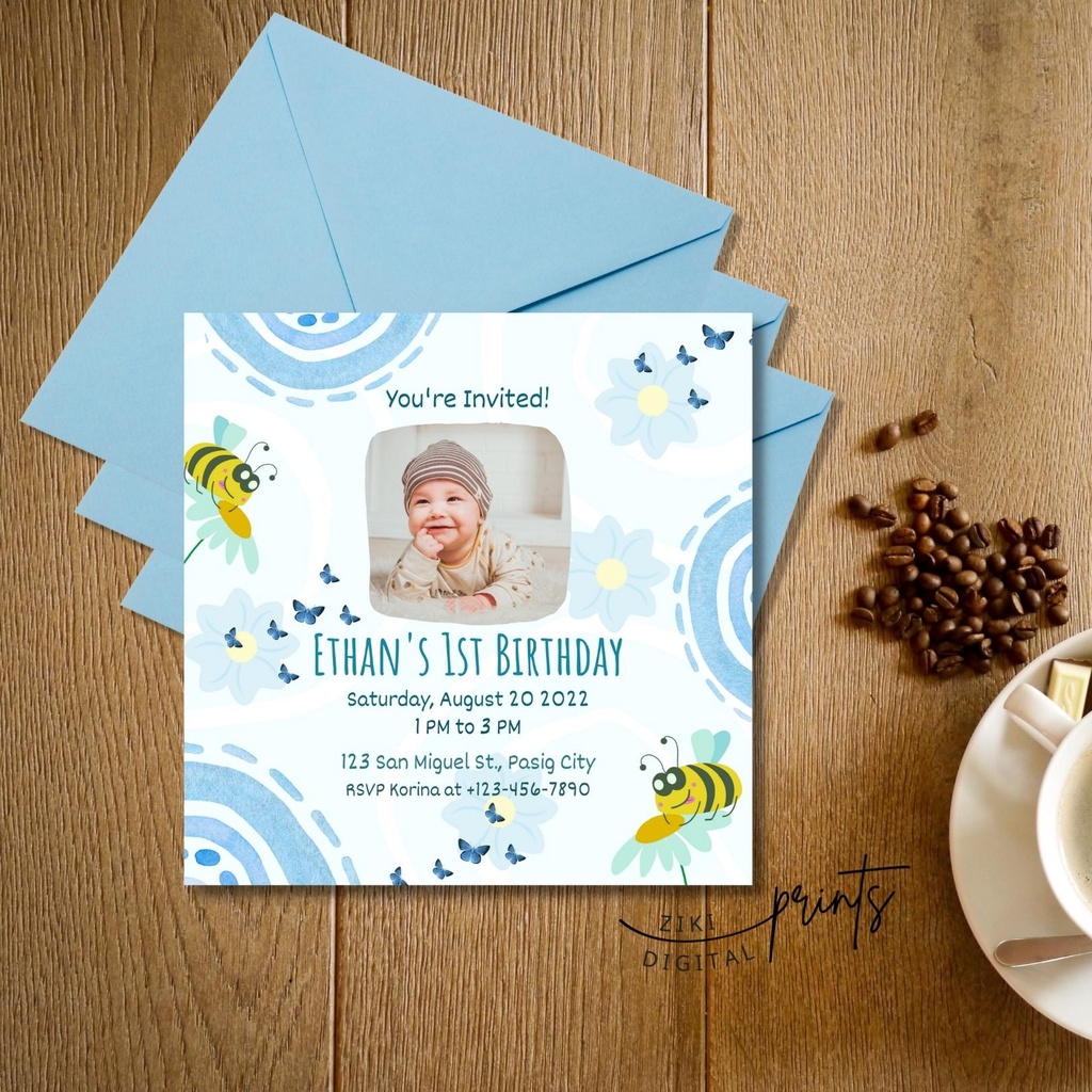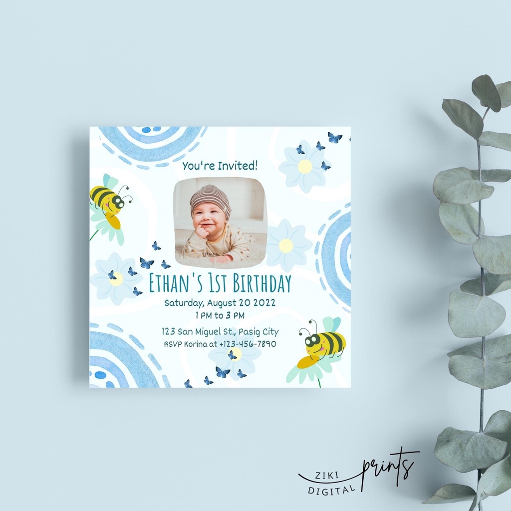 Blue Boho Rainbow Birthday Invitation cards, 1st Birthday Invite Customized personalized invitation