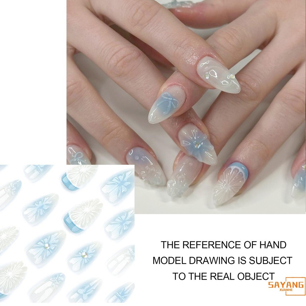 Blush Blue Fake Nails with Bowknot Decor Ultra-flexible Long Lasting Fake Nails