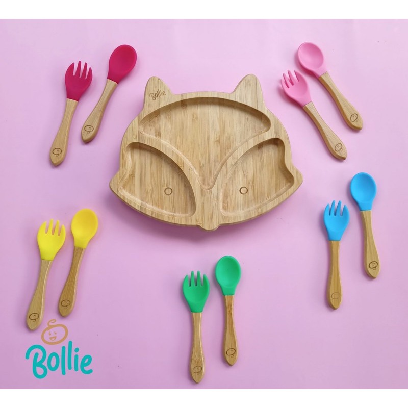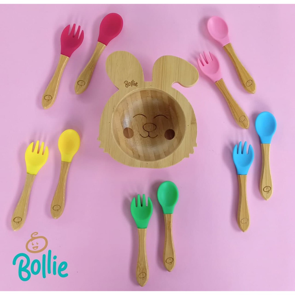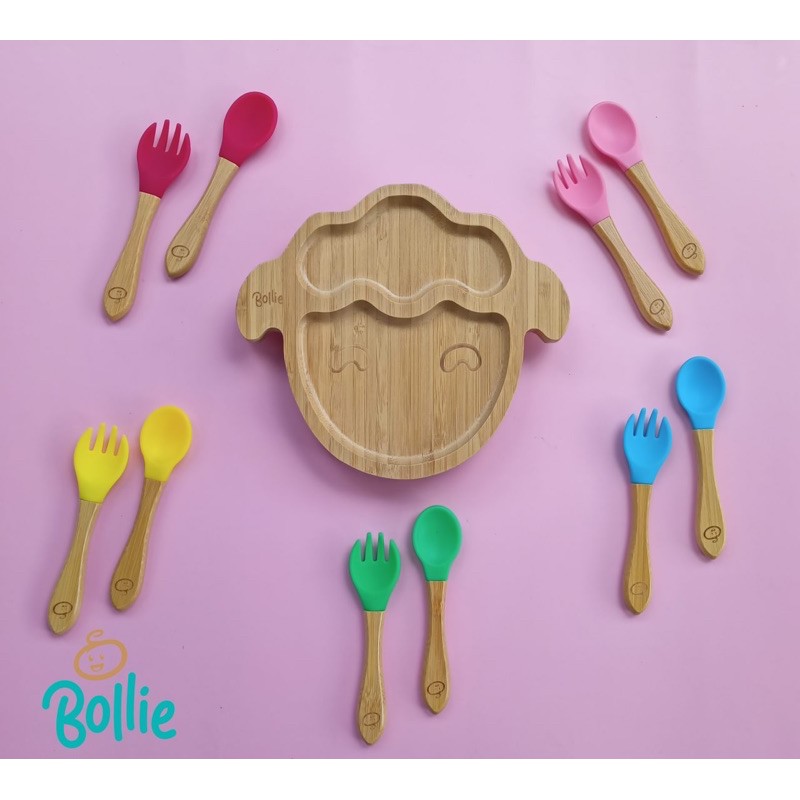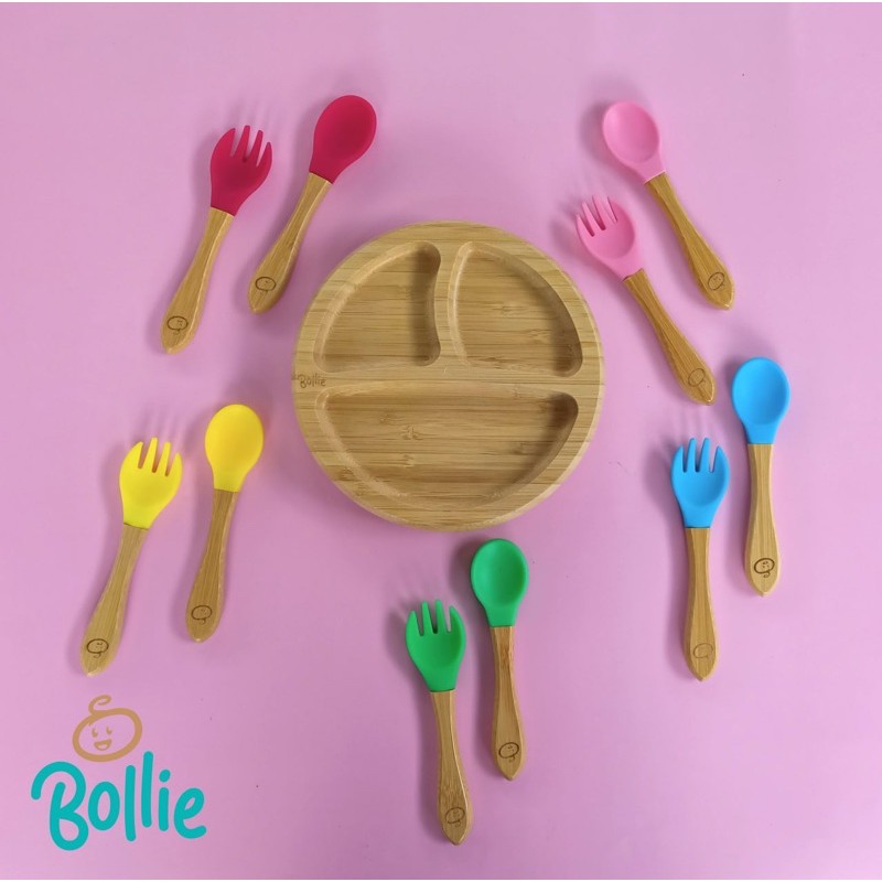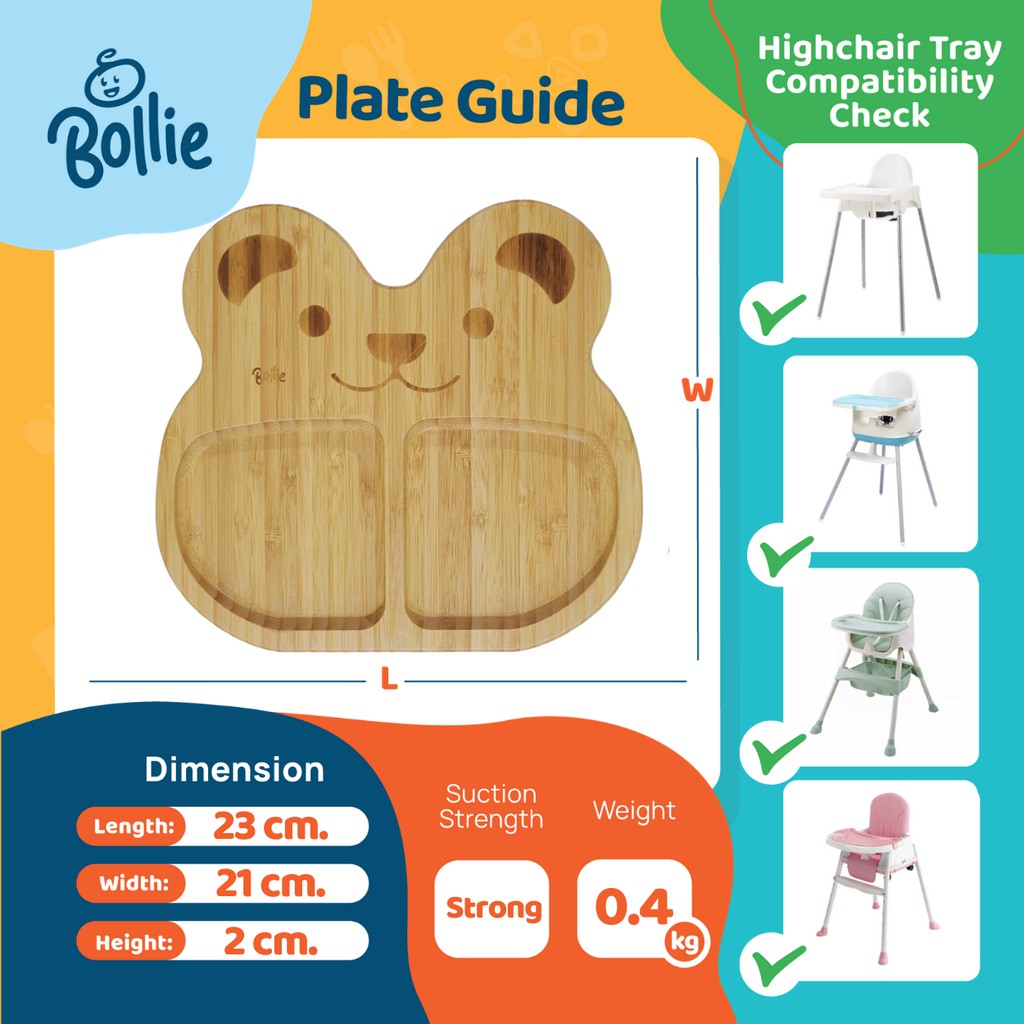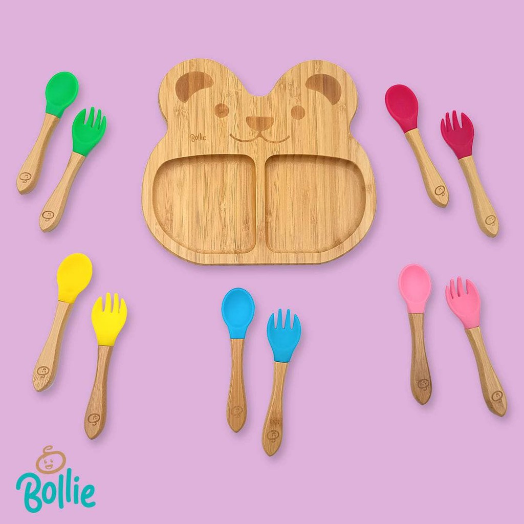 Bollie Baby Classic Bamboo Suction Plate w/ Spoon and Fork (Strong Suction, BPA Free)