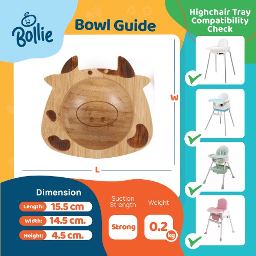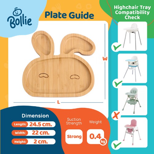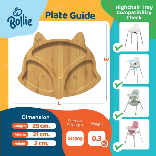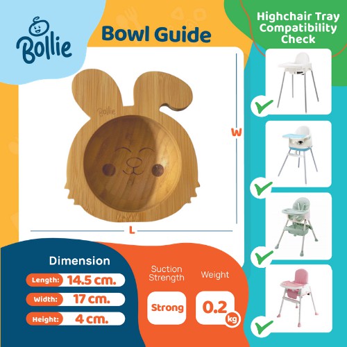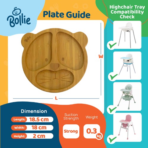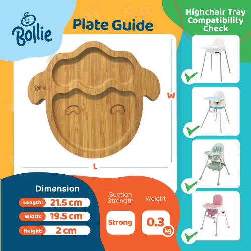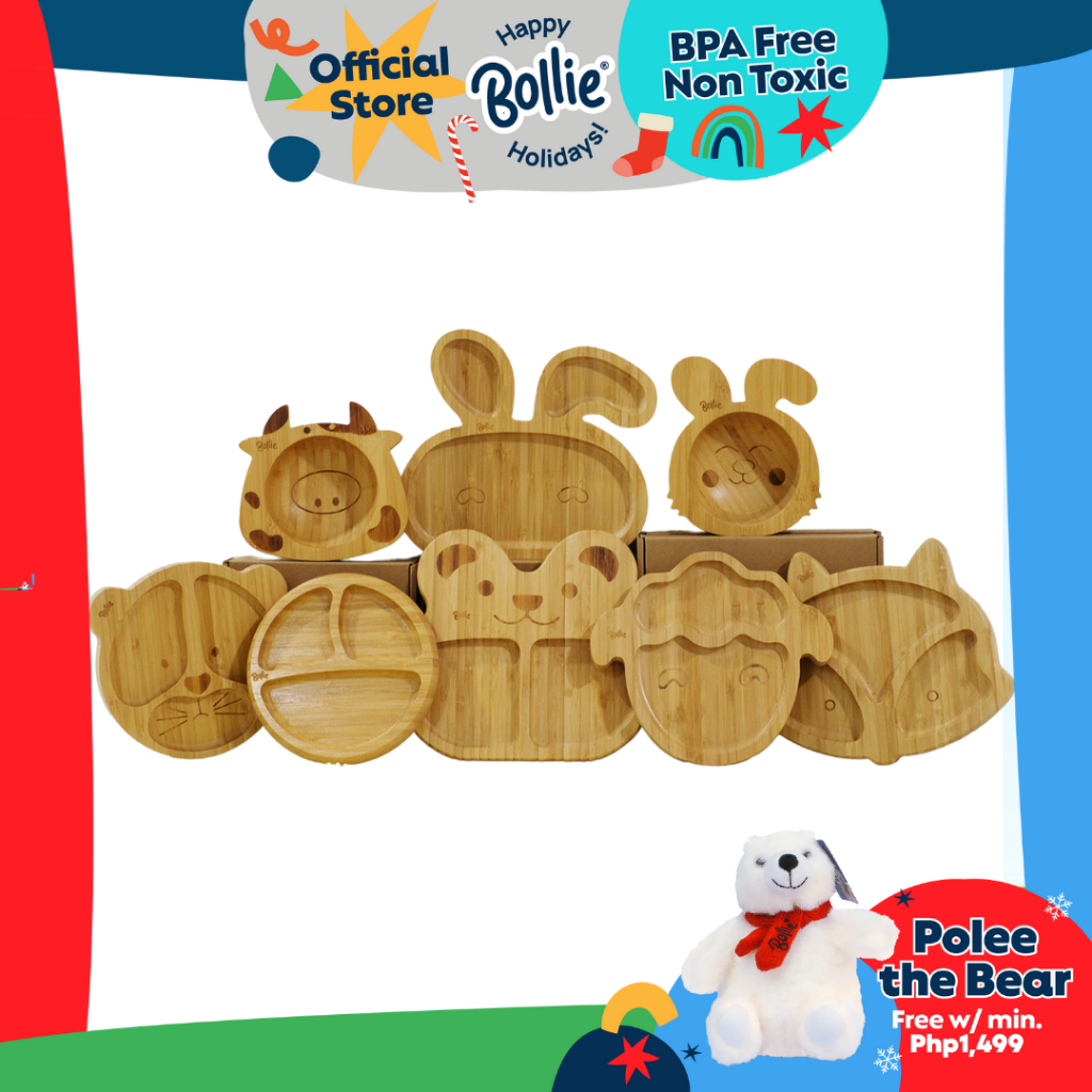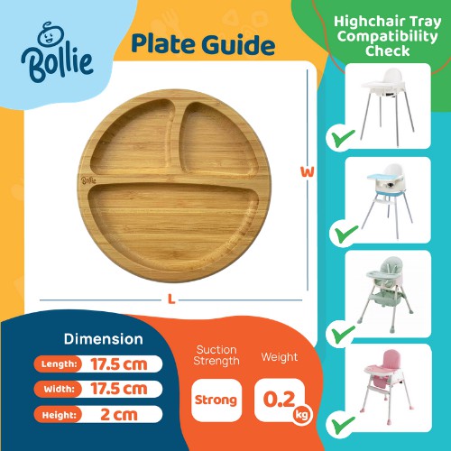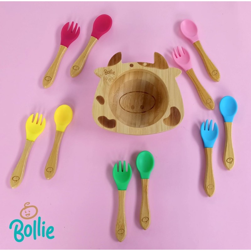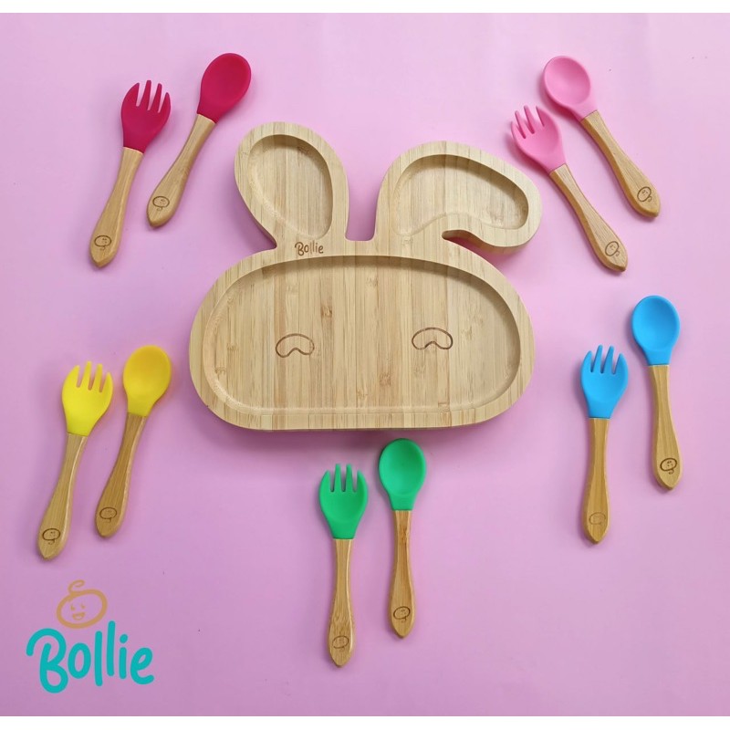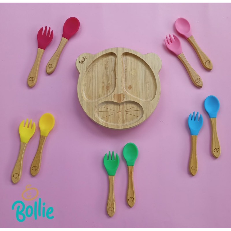 Bollie Baby Classic Bamboo Suction Plate w/ Spoon and Fork (Strong Suction, BPA Free)