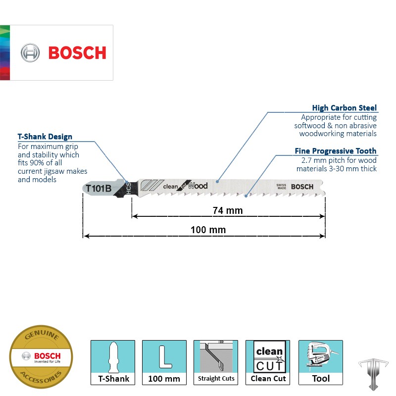 Bosch 2608630030 T101 B T-Shank Jigsaw Blade for Clean Straight Cuts for Wood (5 pieces)