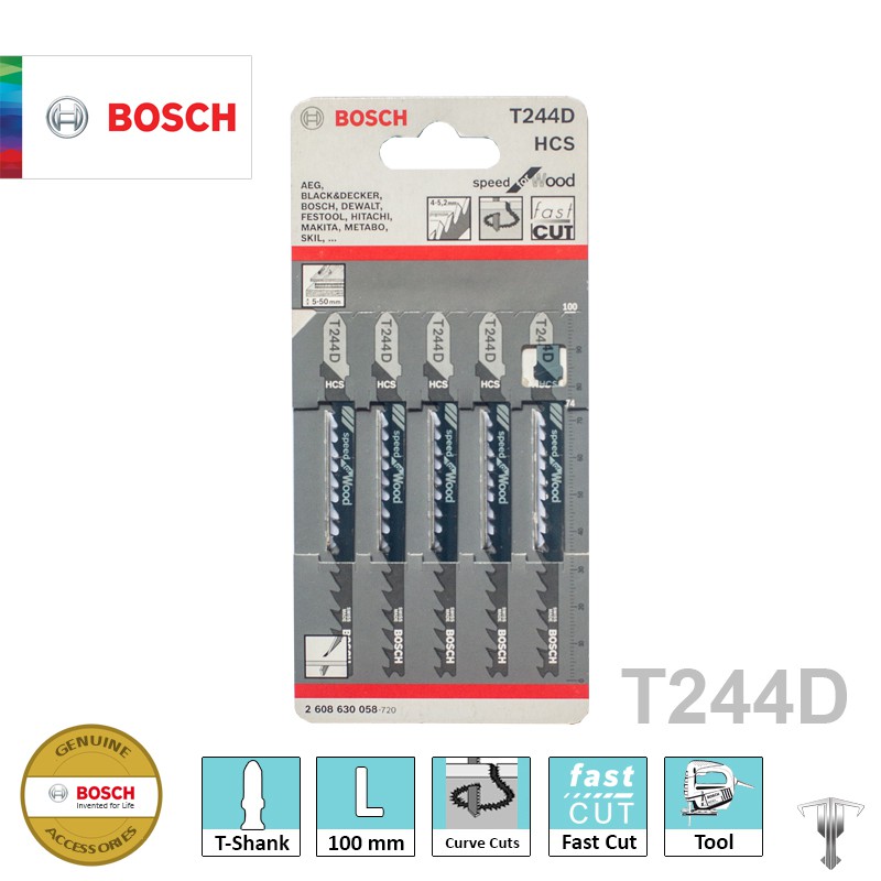 Bosch 2608630058 T244 D T-Shank Jigsaw Blade for Fast Coarse Curve Cuts in Wood (5 pieces)