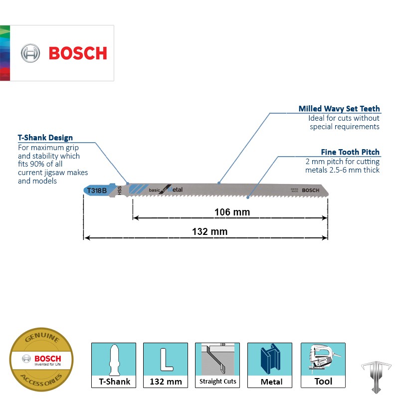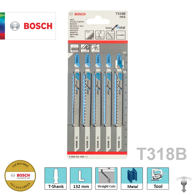 Bosch 2608631404 T318 B T-Shank Jigsaw Blade for Straight Cuts Basic for Metal (5 pieces)