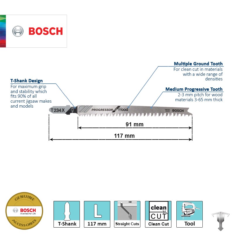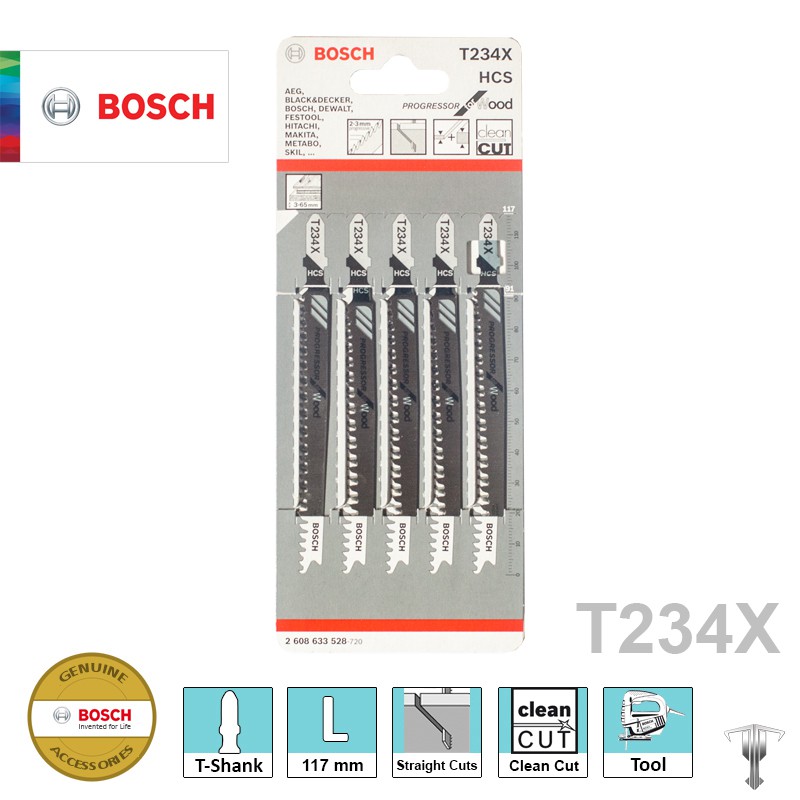 Bosch 2608633528 T234 X T-Shank Jigsaw Blade Progressor for Clean Straight Cuts in Wood (5 pieces)