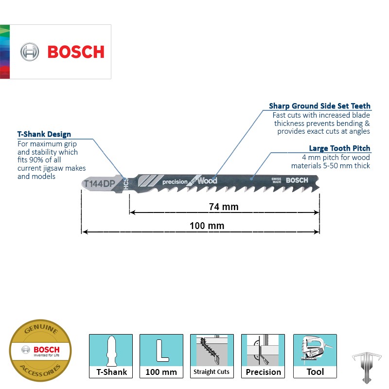 Bosch 2608633A35 T144 DP T-Shank Jigsaw Blade for Fast Precise Straight Cuts for Wood (5 pieces)