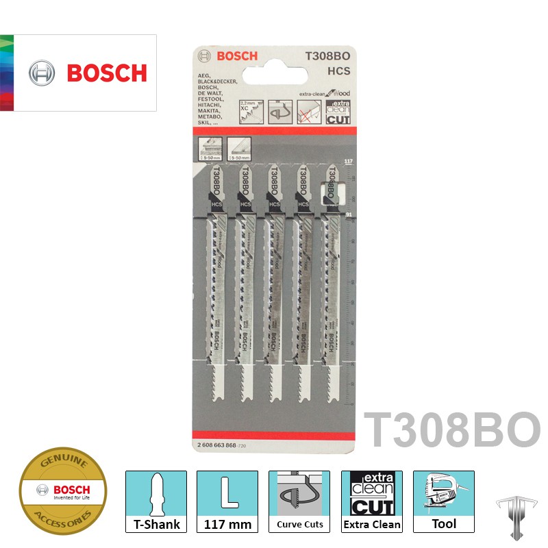 Bosch 2608663868 T308 BO T-Shank Jigsaw Blades for Curve Extra Clean Cuts for Wood (5 pieces)