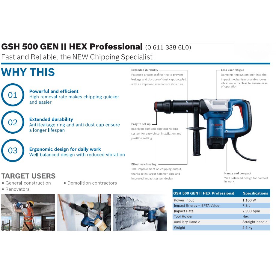 Bosch Demolition Hammer GSH 500 (Hex Pointed Chisel Included)
