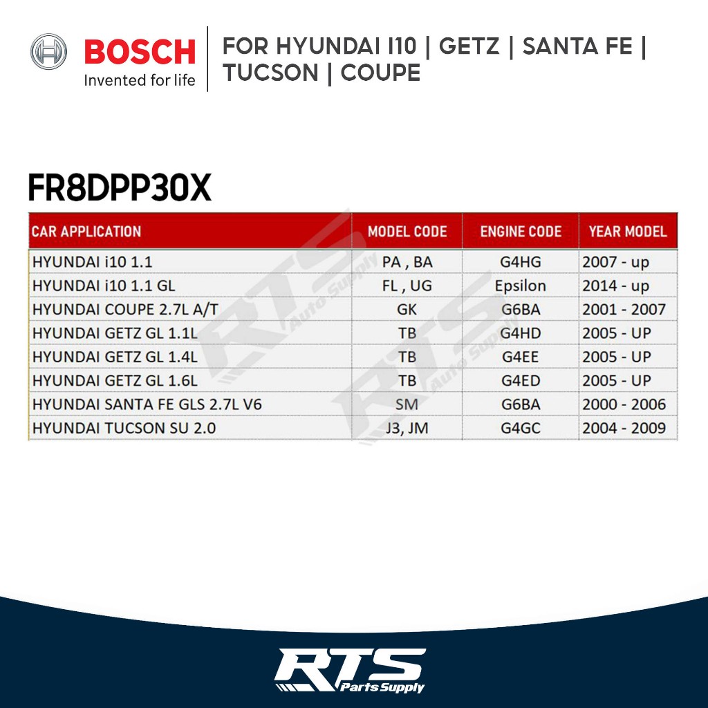 Bosch Platinum Spark Plug Hyundai i10 / Tucson / Santa Fe / Getz GL Coupe FR8DPP30X ( BKR5EGP ) 4pcs