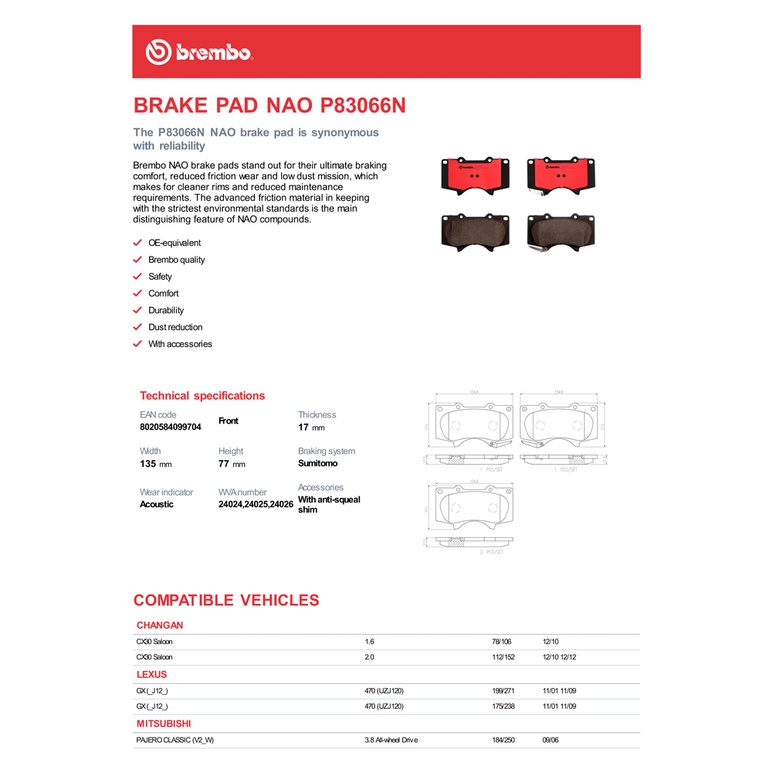 BREMBO P83102N Front Ceramic Brake Pads for Toyota Hilux 2015-Present