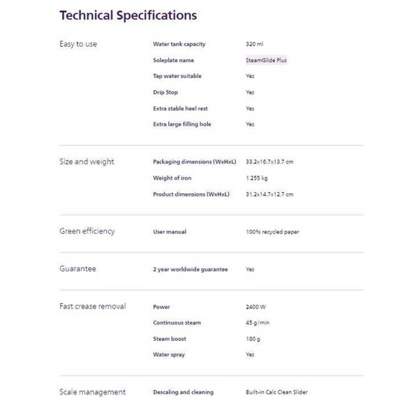 PHILIPS 5000 Series Steam Iron Dst5030/20 2400W 45G/Min Continuous 180G Boost Steamglide 051
