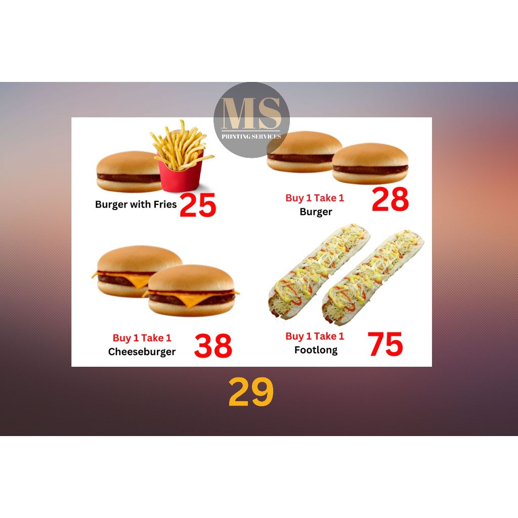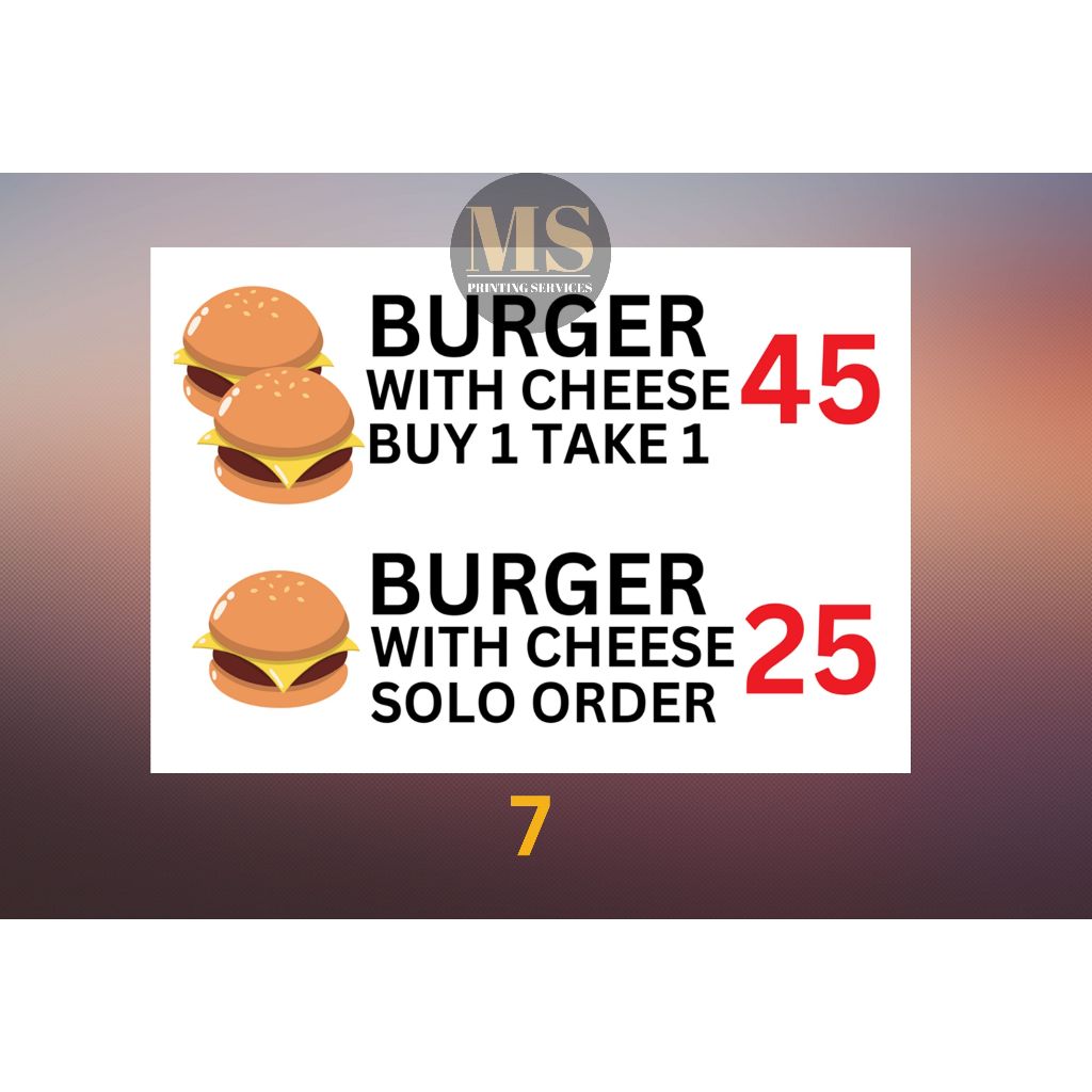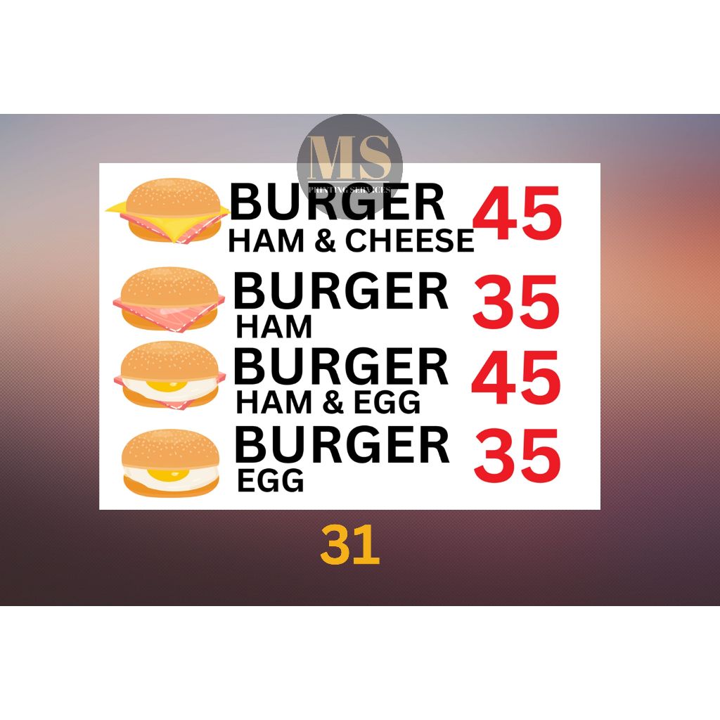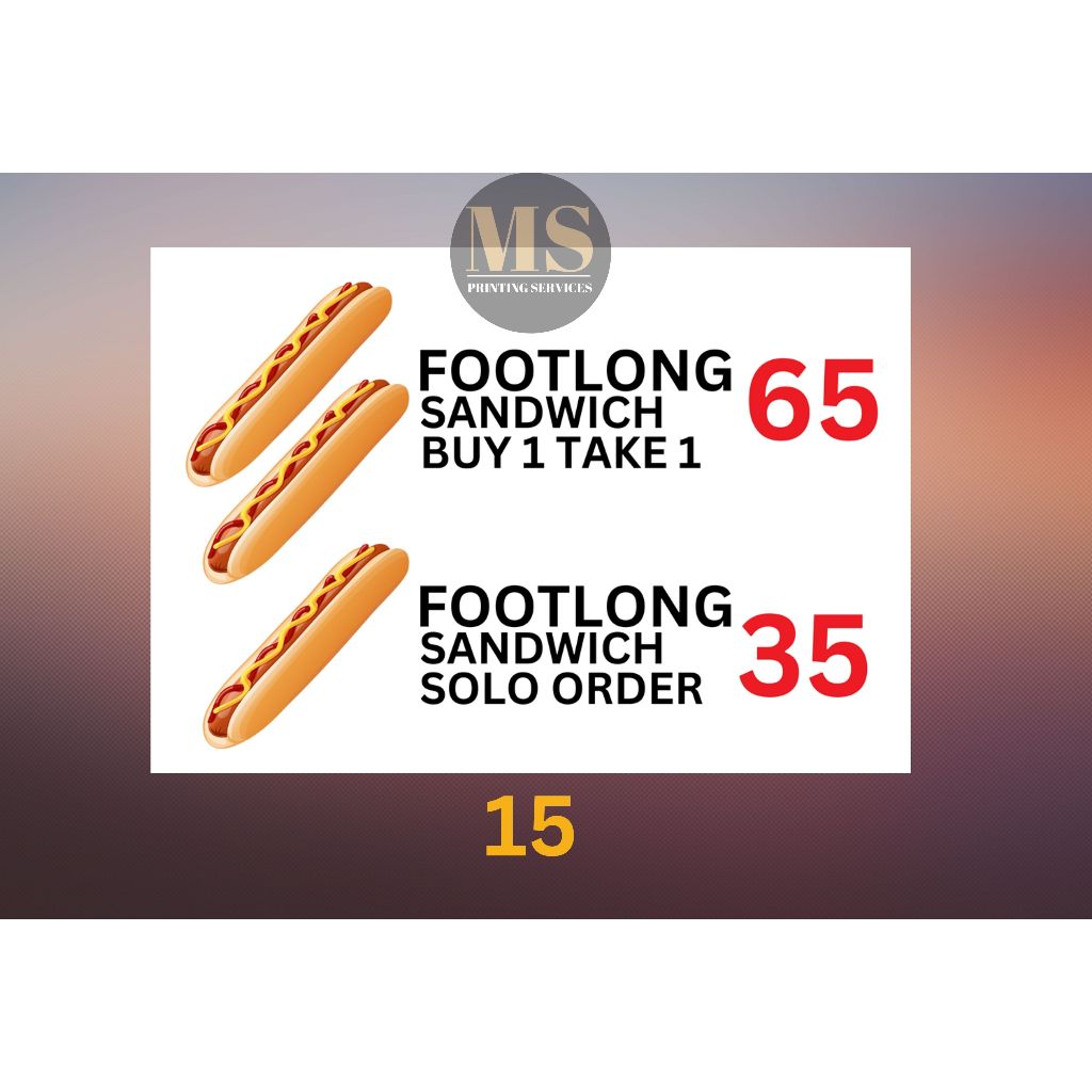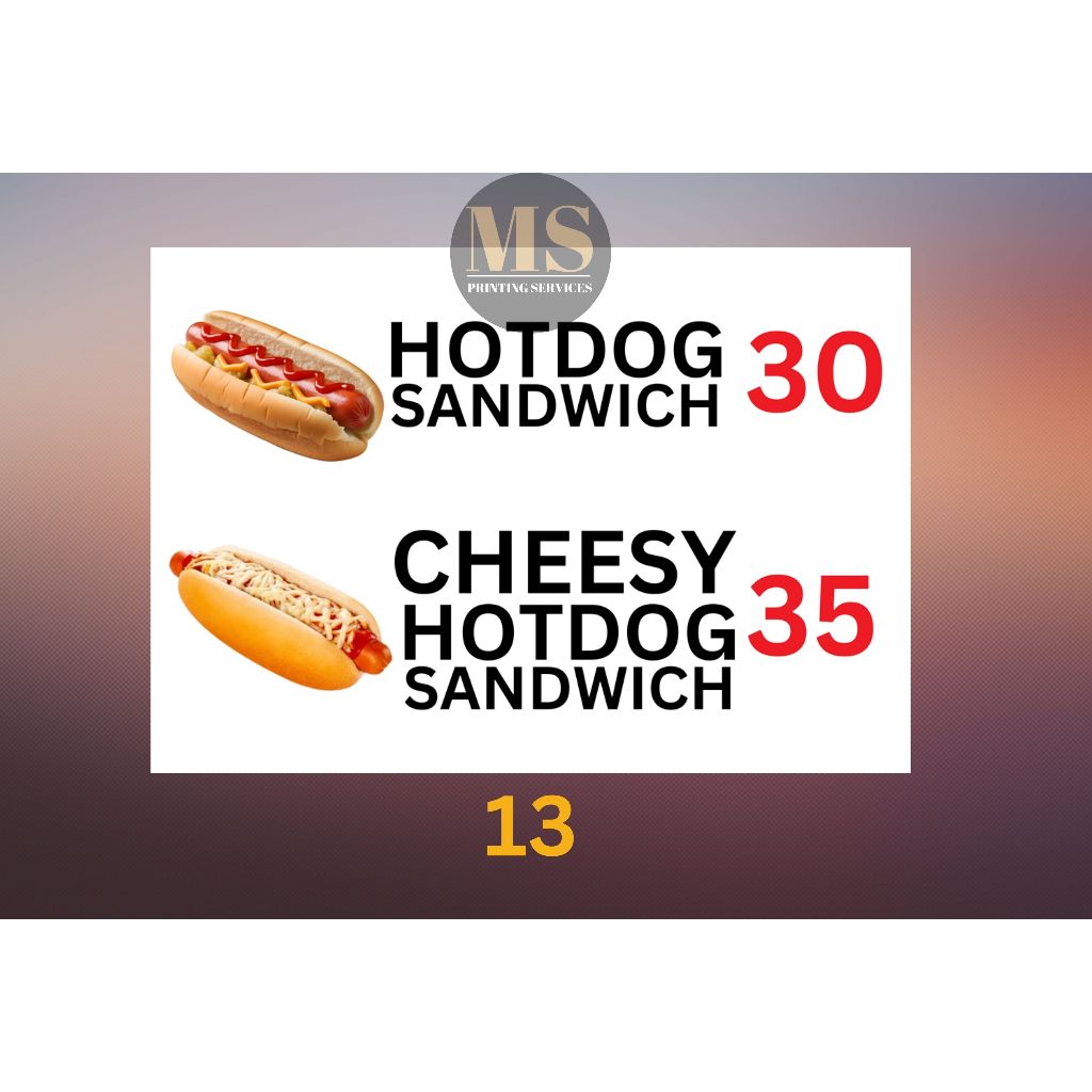 Burger Hotdog Ham and Cheese Siomai Footlong Laminated Signage and Waterproof Vinyl Sticker A4 Size
