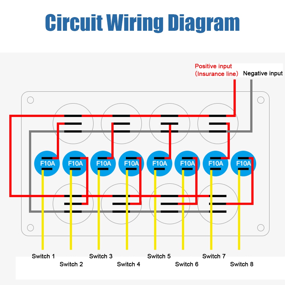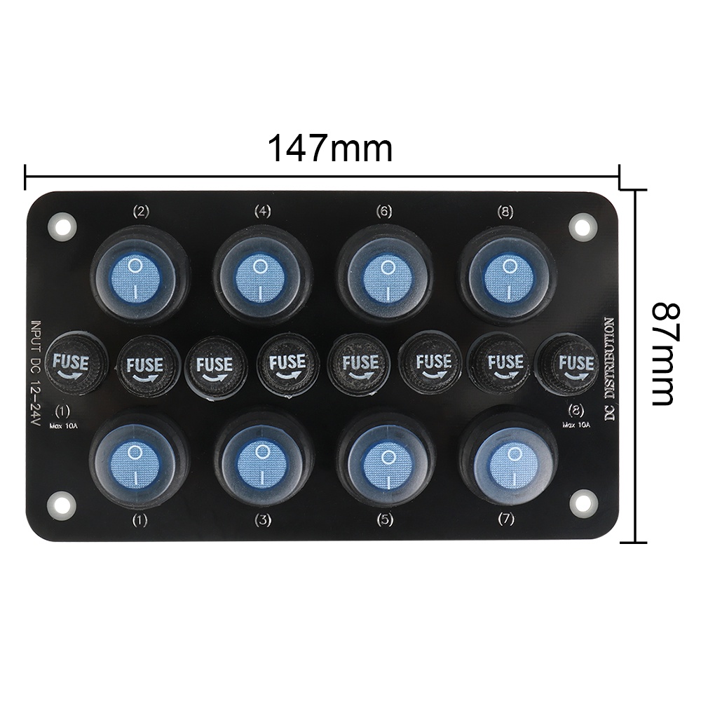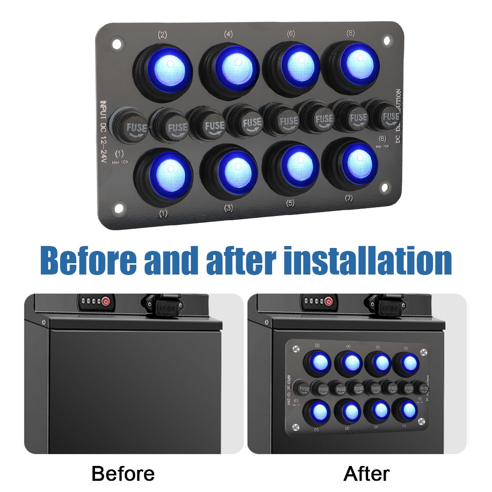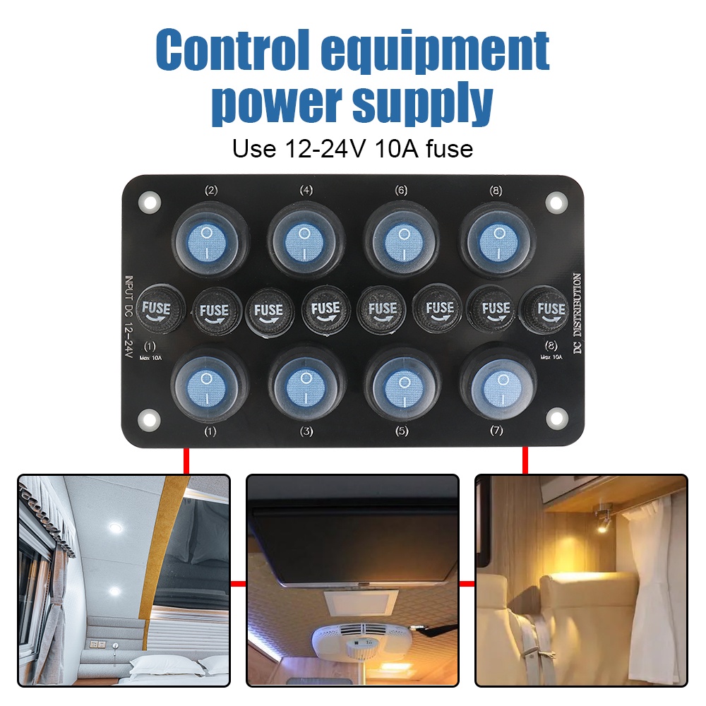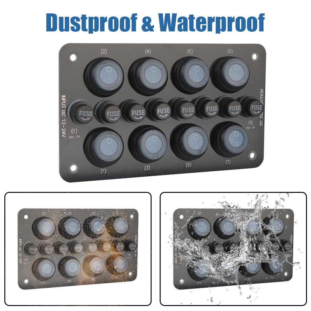 Button Rocker Toggle Switch Panel Waterproof 8Gang 12~24V Replaceable Fuse Holder Circuit Breaker