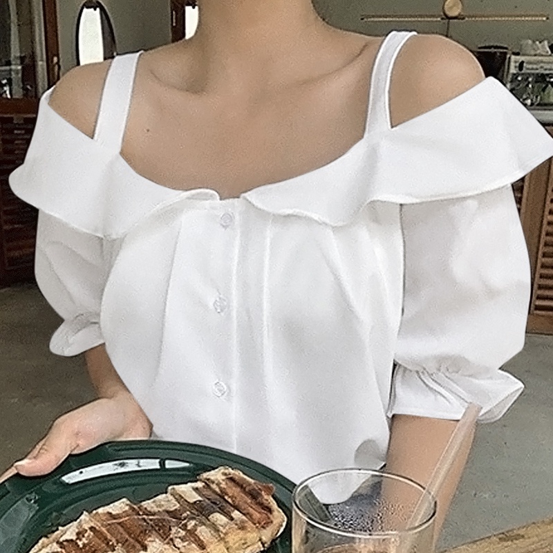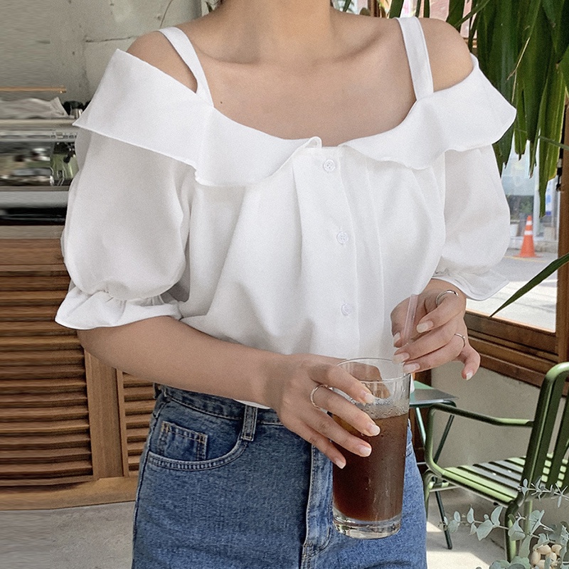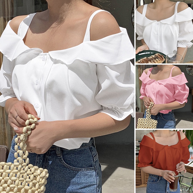 CELMIA ZANZEA Women Puff Half Sleeve Off Shoulder Spaghetti Strap Ruffle Casual Shirt Plus Size Tops