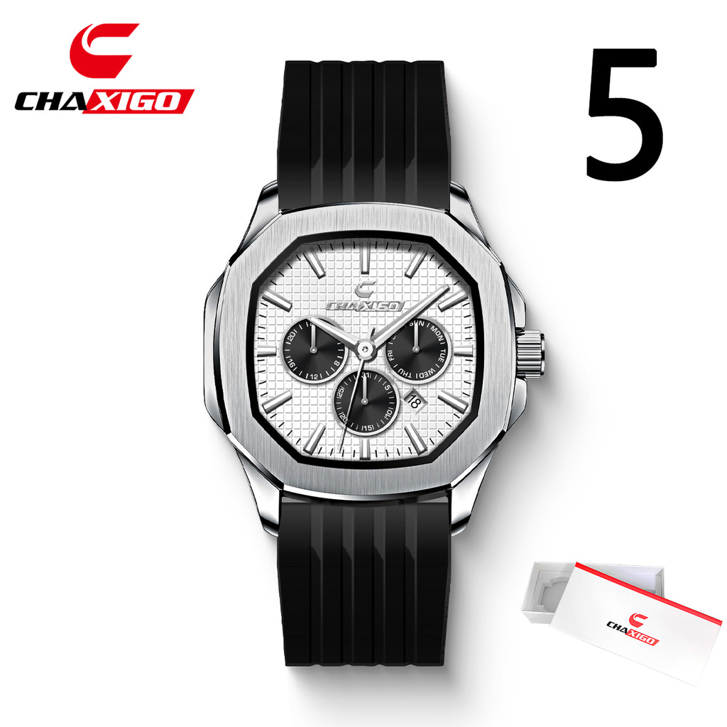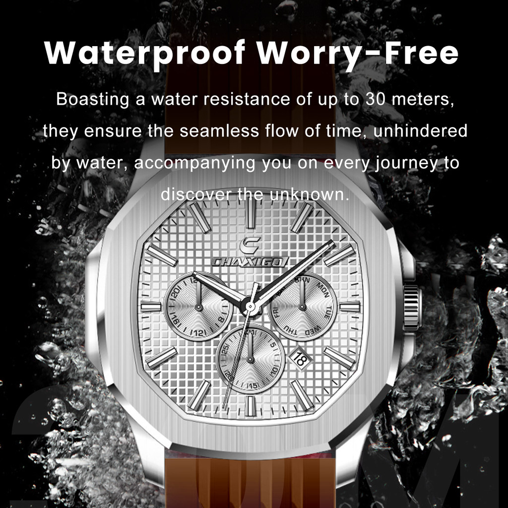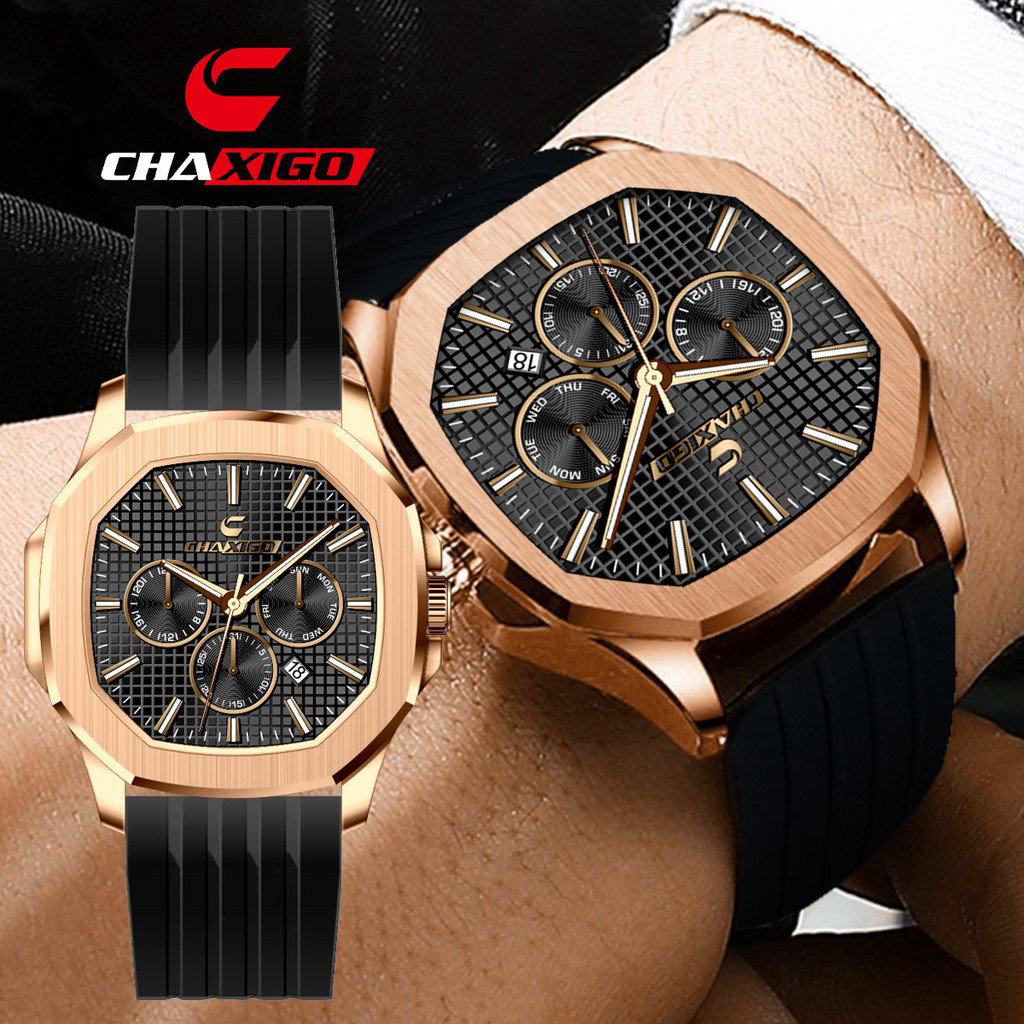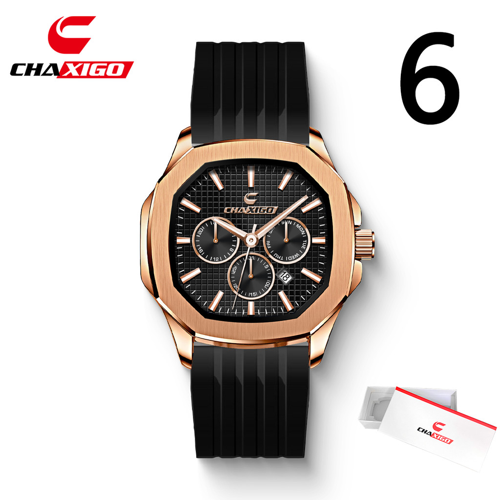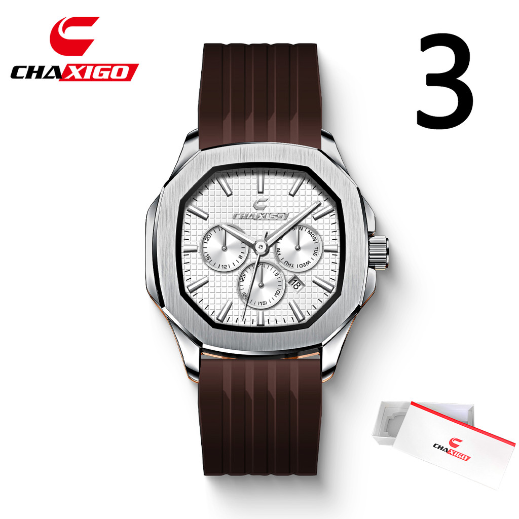 CHAXIGO Watch for Men Luxury Brown Silicone Waterproof Quartz Sport Date Display Luminous Fashion Square Round Dial Wristwatch 6545G