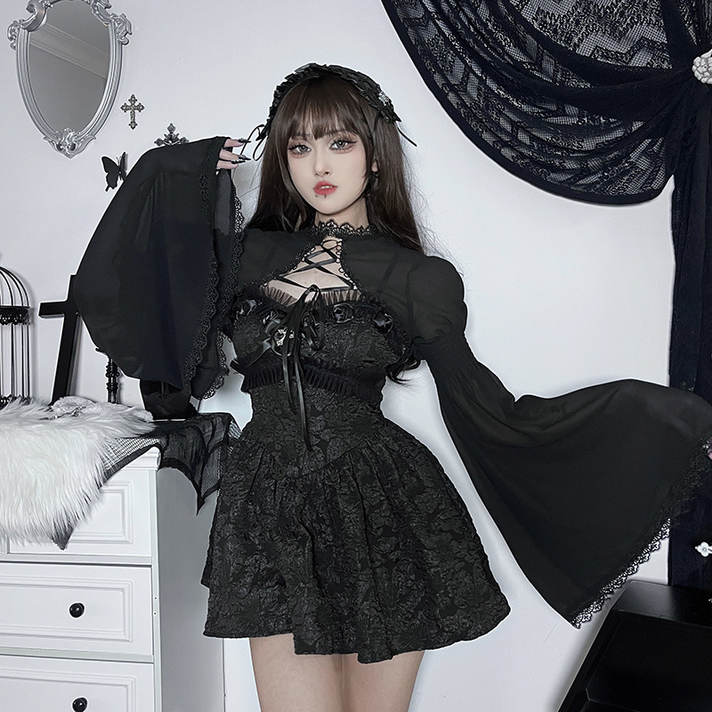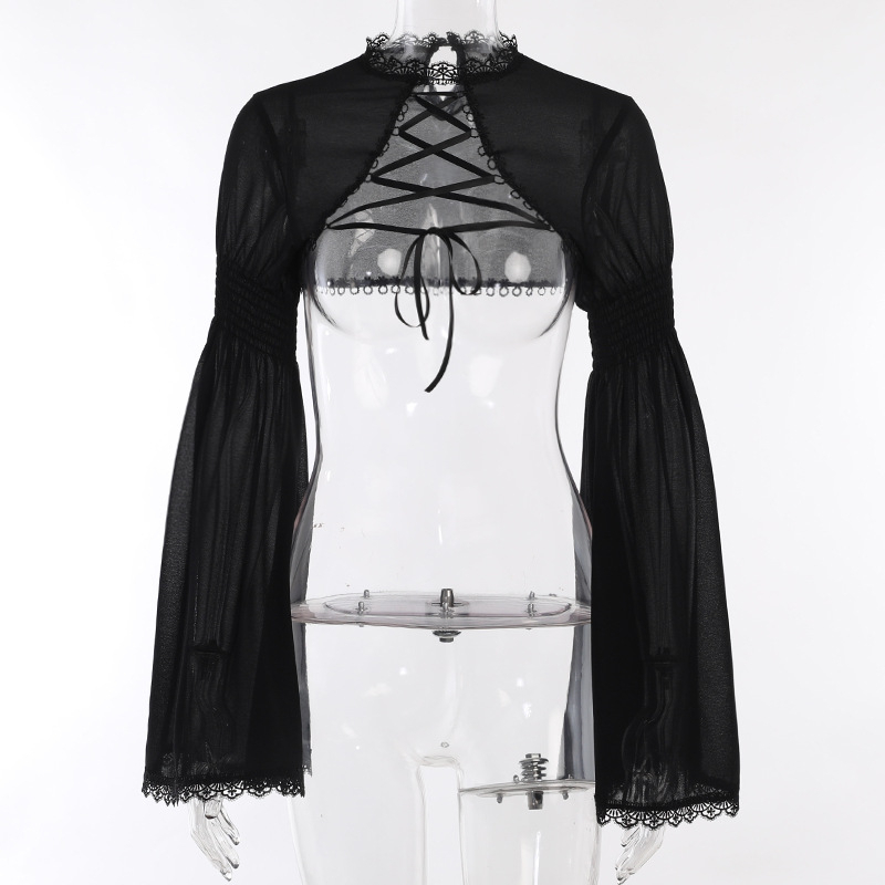 CHUNGLO Goth Fashion Women Top Long Flare Sleeve Round Neck Lace Patchwork Gothic Style Ladies Shawl For Summer