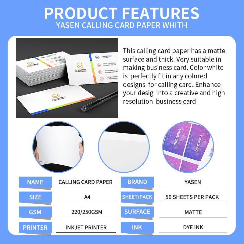 Calling Card Paper White 220/250Gsm A4 Double Side Paper Matte 50Sheets Yasen Brand
