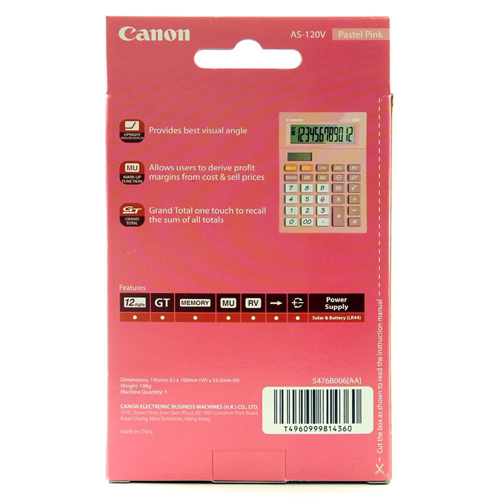 Canon AS-120V Dual Power Desktop Calculator (Pastel Pink)