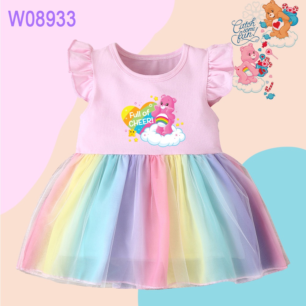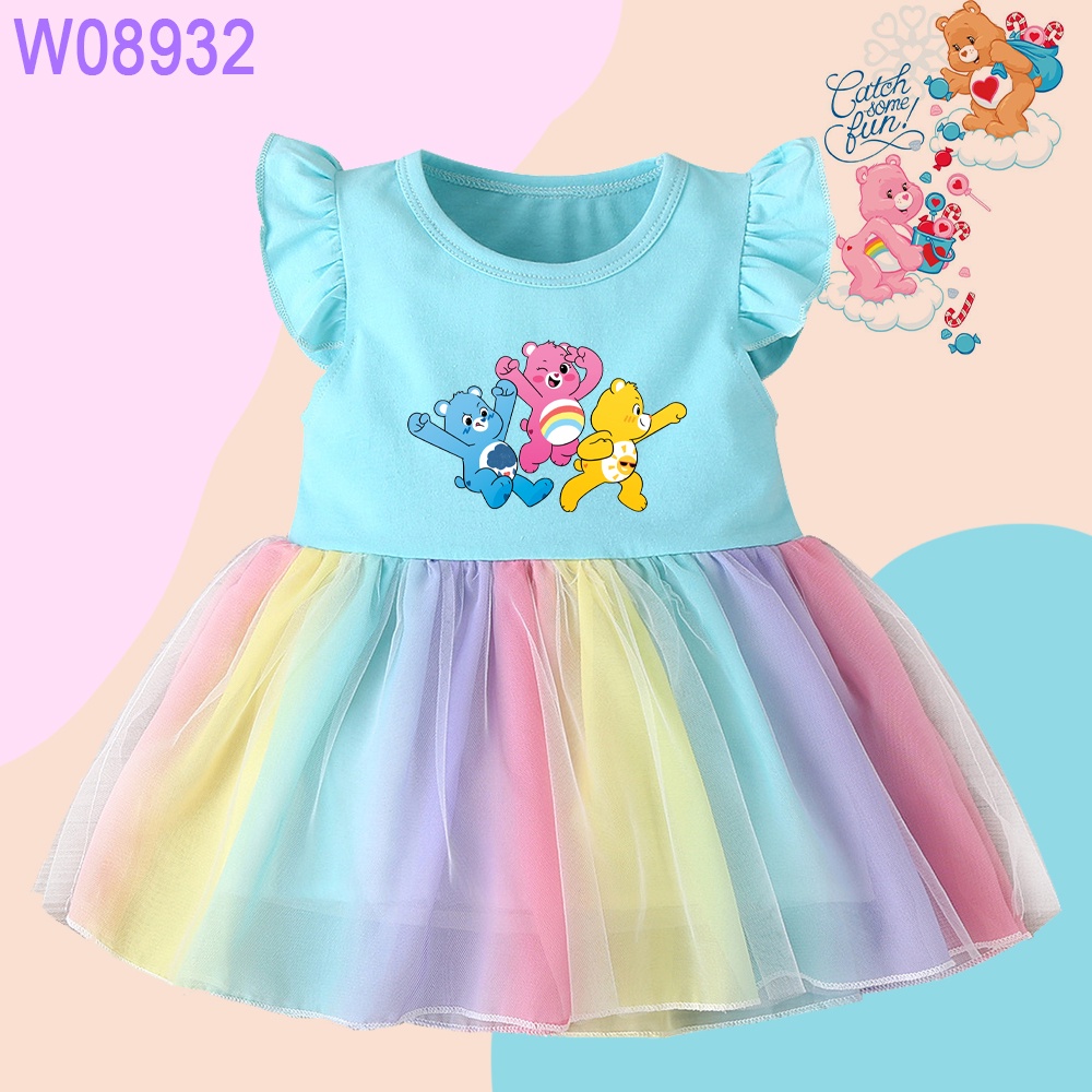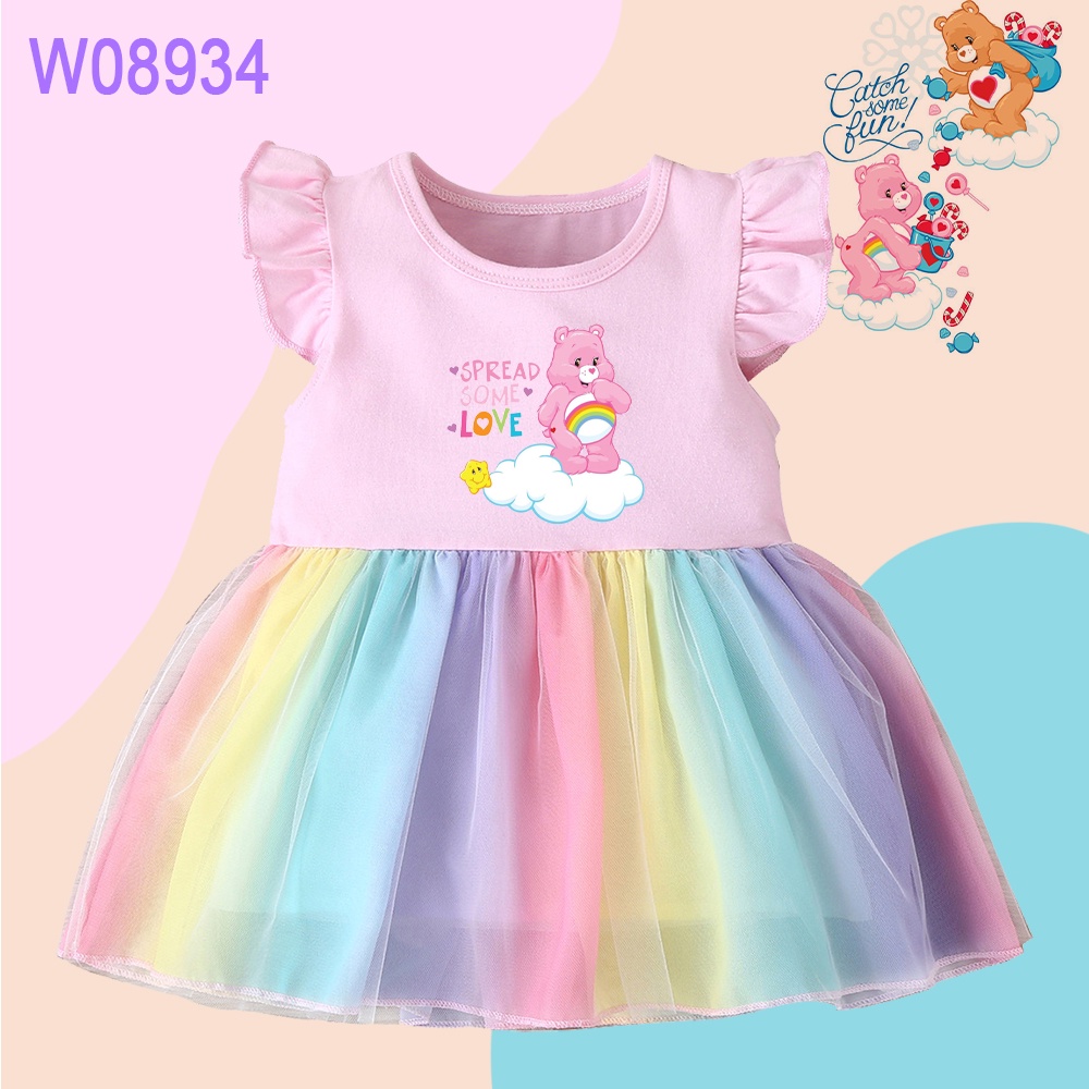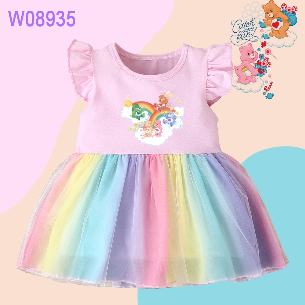 Care Bears Print Rainbow Mini Dress Girls Ruffle Sleeve Dress Cartoon Care Bears Cute Baby Princess Dress