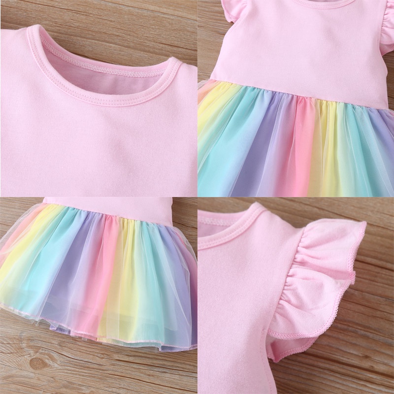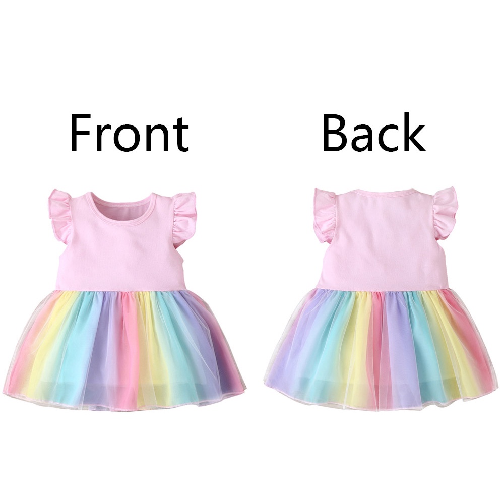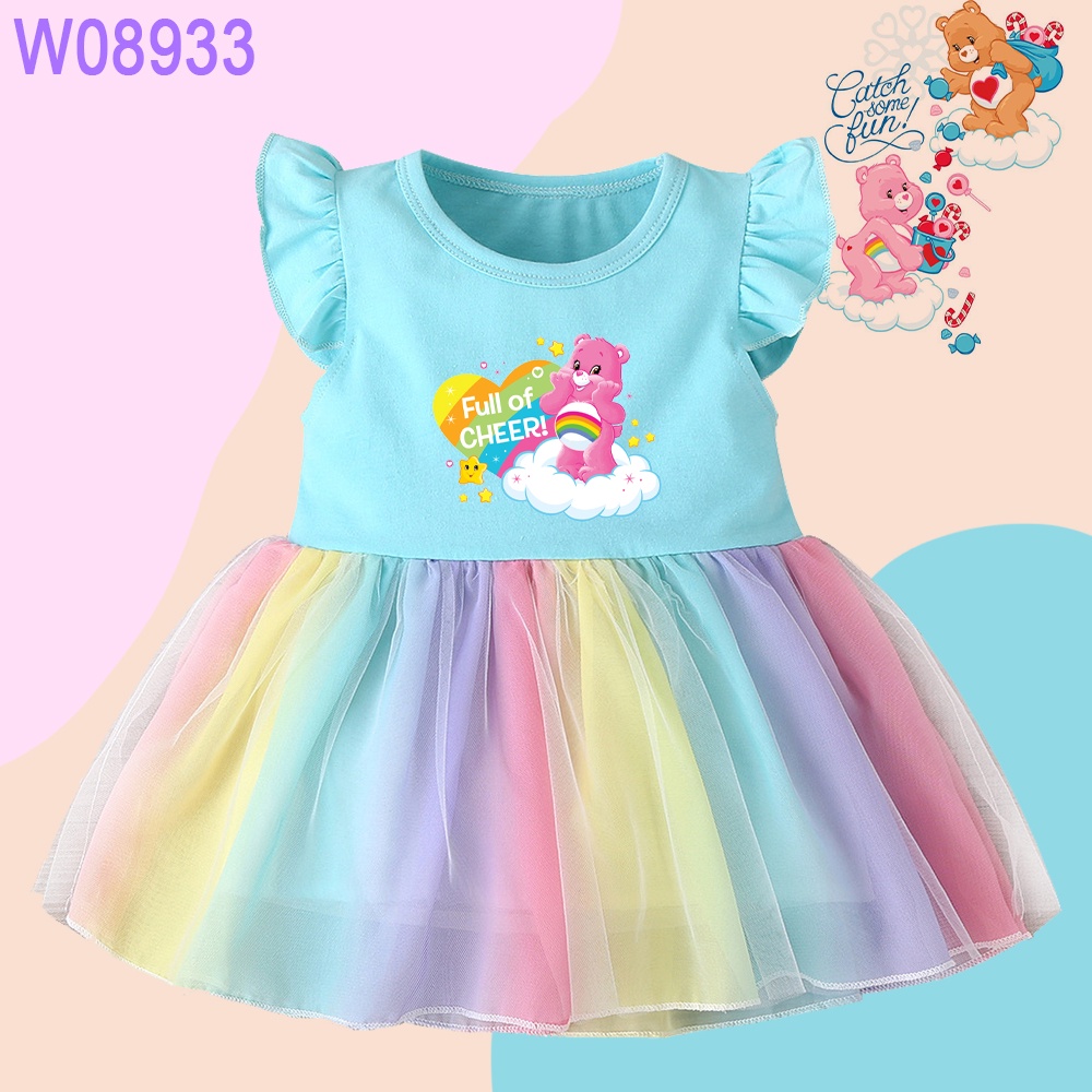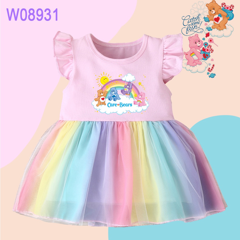 Care Bears Print Rainbow Mini Dress Girls Ruffle Sleeve Dress Cartoon Care Bears Cute Baby Princess Dress