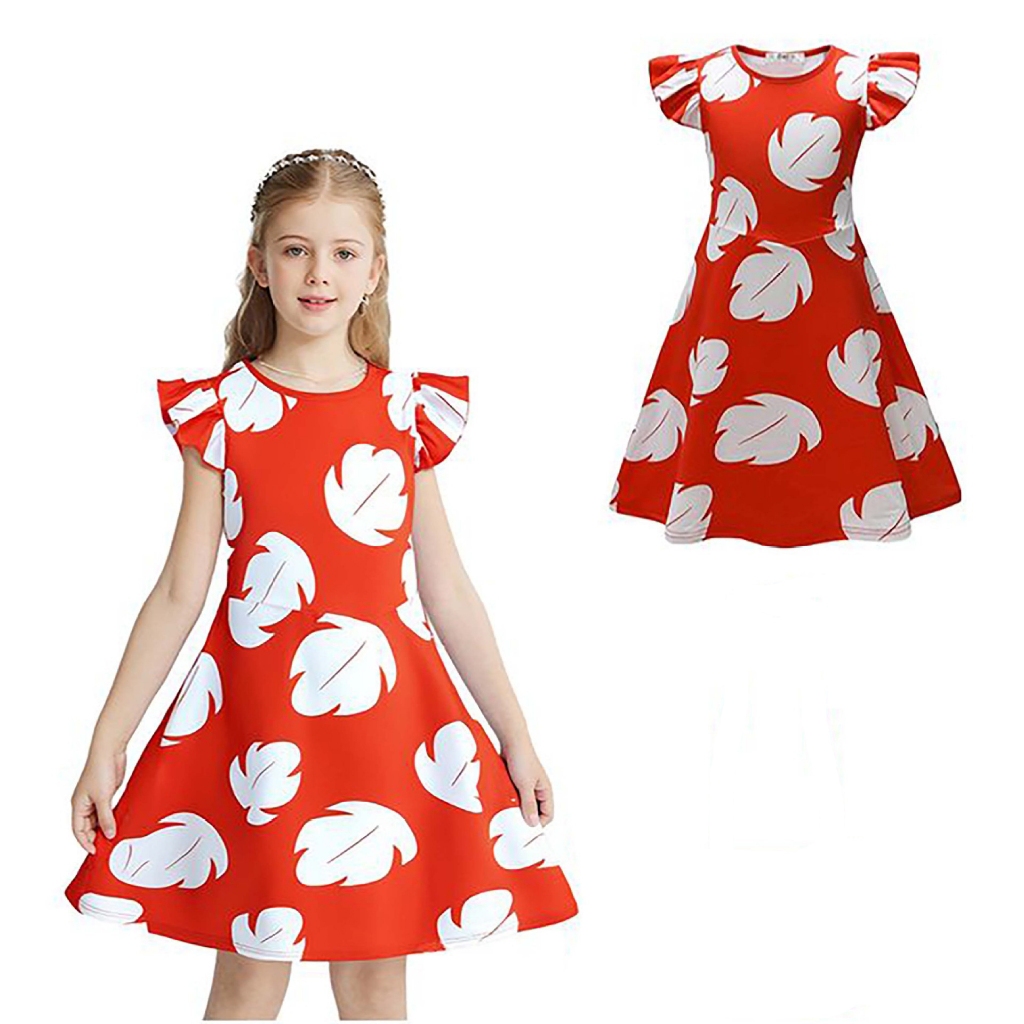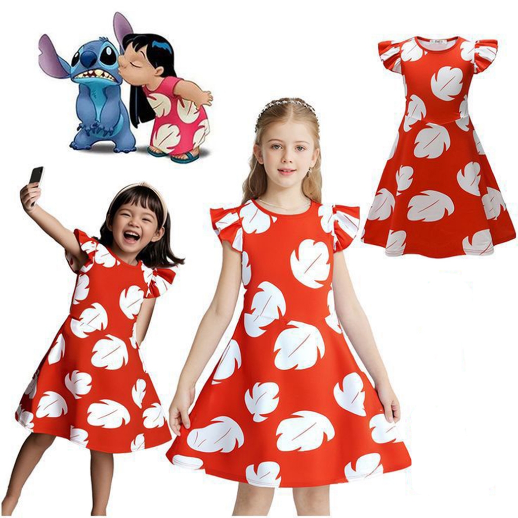 Cartoon Lilo Stitch Red Dress Girls Flying Sleeves Dresses
