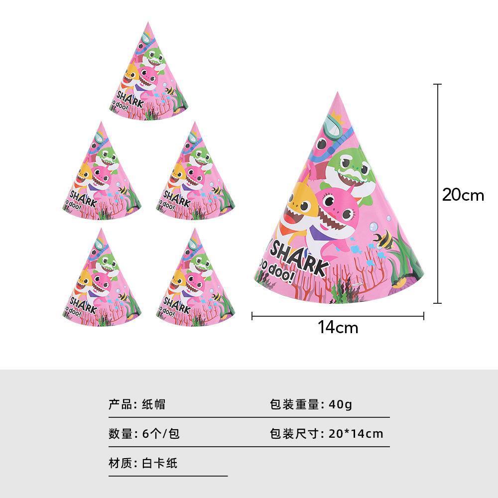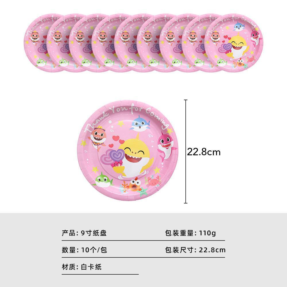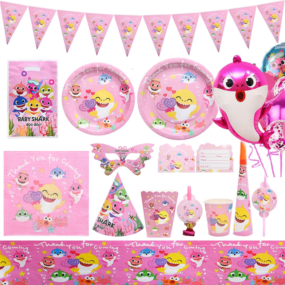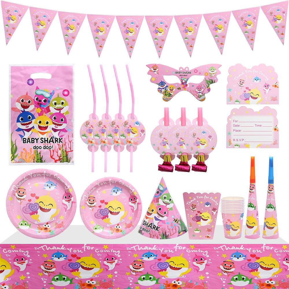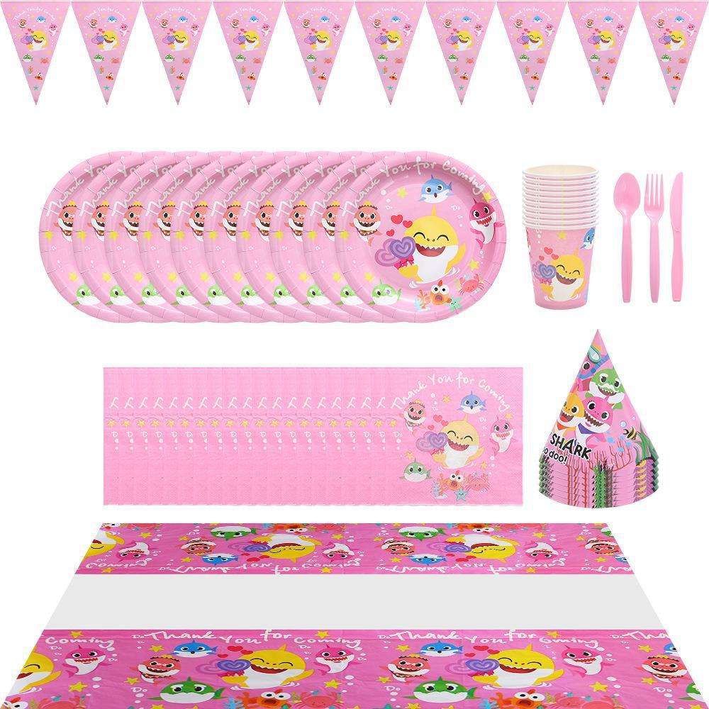 Cartoon Pink Shark Baby Children's Birthday Party Decor Paper Plate Cup Disposable Tableware Banner Gift Bag Hat Horn Invitation Card Popcorn Box Sharkbaby Theme Baby Shower Decor
