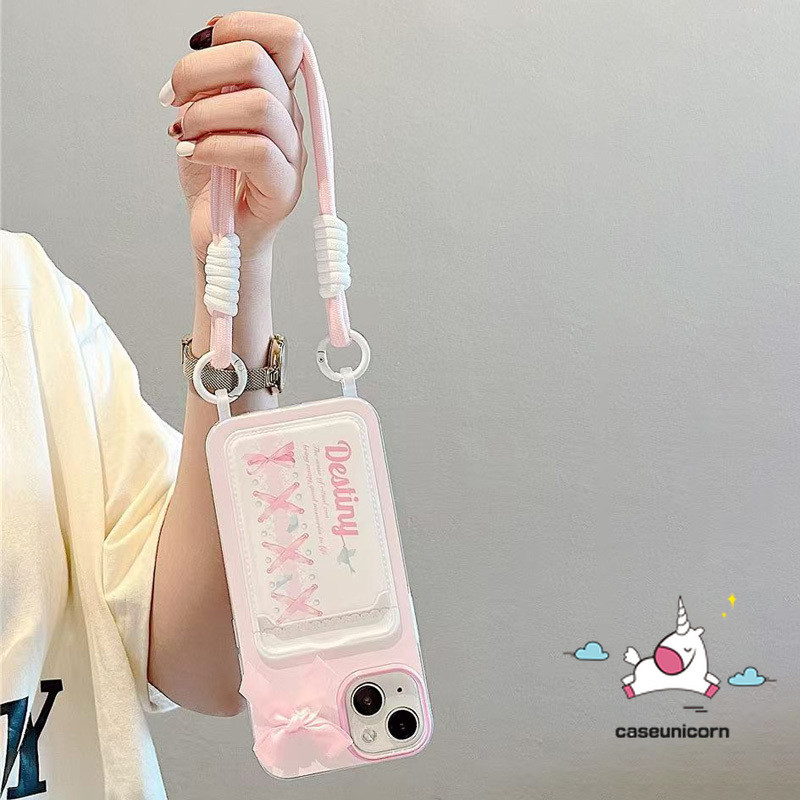Cartoon fantasy pink bow cute Graffiti Case Compatible for IPhone Air 17 16 12 13 15 11 14 Pro Max XR X 16 6 15 6s 7 8 Plus XS Max Luxury Wallet Slot Card Double Lanyard Soft Case