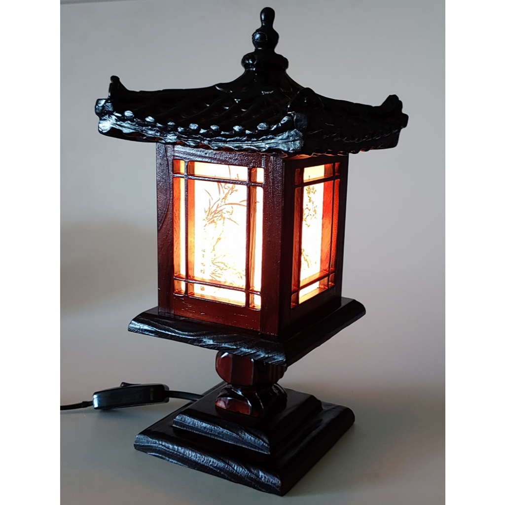 Carved Wood Bedside Lamp Handmade Traditional Korean House Pavilion Pagoda Design Art Deco Lantern Brown Asian Oriental Bedroom Lamp Accent Unusual Light