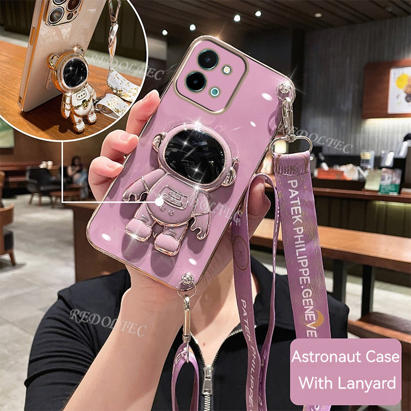 Case VIVO Y28 4G 2024 New Fashion Cute 6D Electroplated Phone Casing VIVOY28 VIVO Y 28 Y28 With Astronaut Stand Holder Long Crossbody Lanyard Strap For Girls