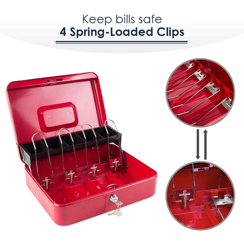 Cash Box with Money Tray Durable Large Steel Money Box 5 Compartment Tray 4 Spring-loaded