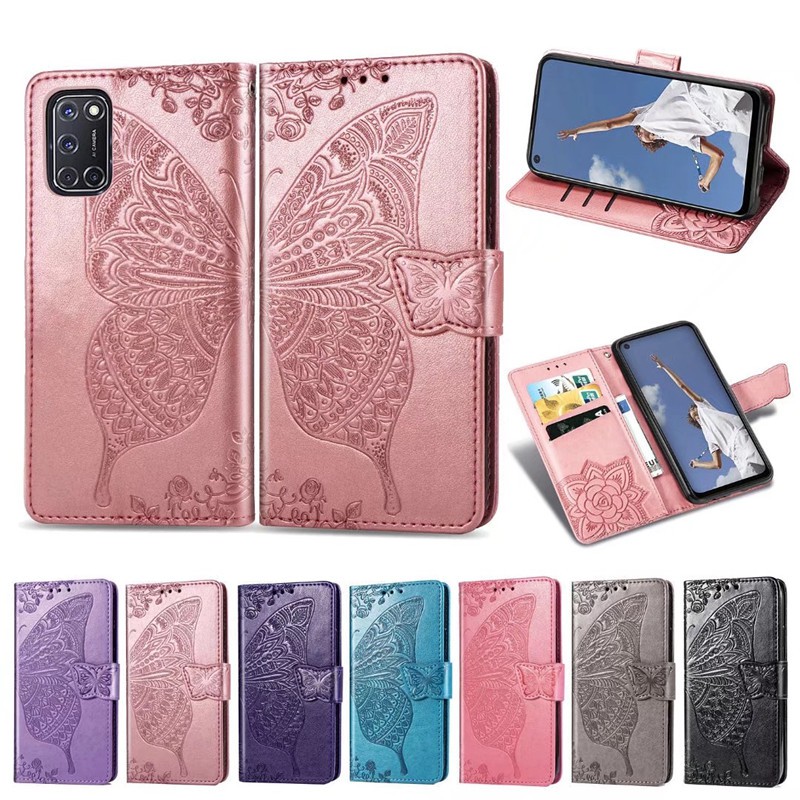 Casing For OPPO A5S A3S A15 A15S A16 A9 2020 A5 2020 A12 A12E Butterfly Embossed Leather Flip Wallet PU Leather Full Protection Shockproof Case Cover With lanyard oppo a5s case oppo a15 case