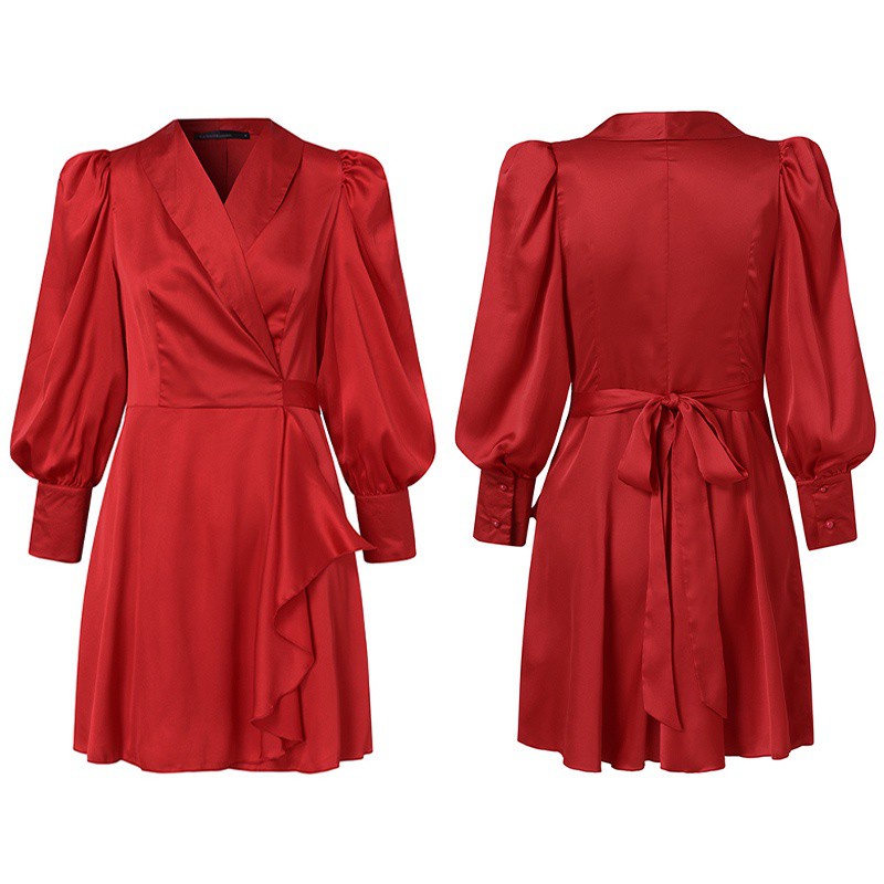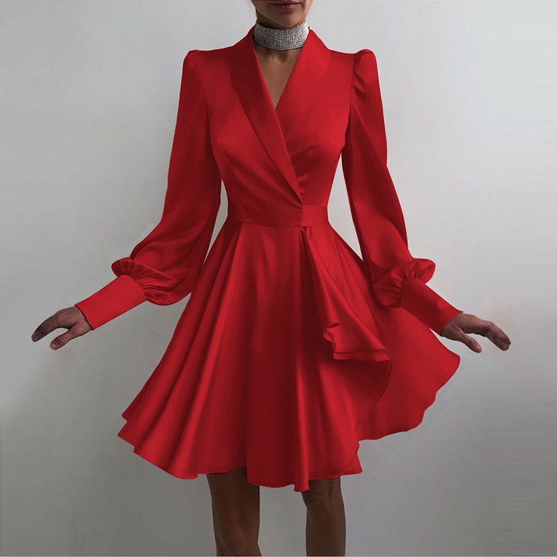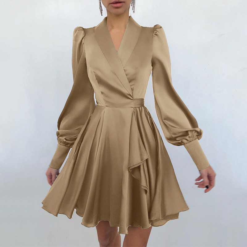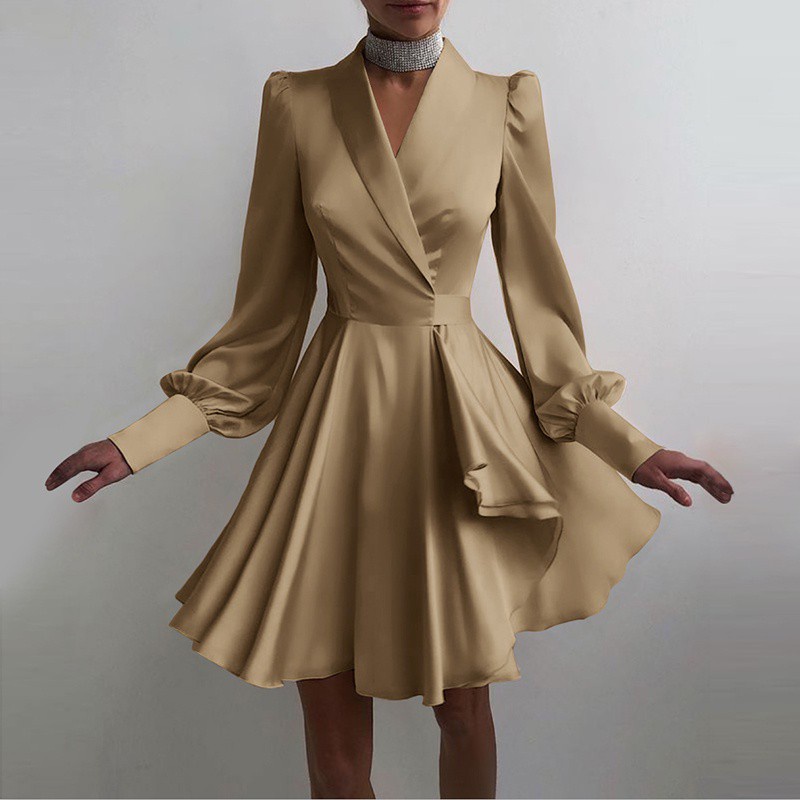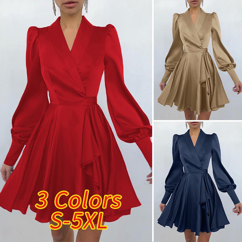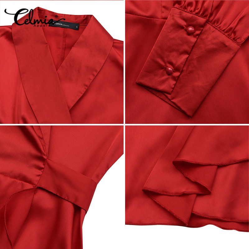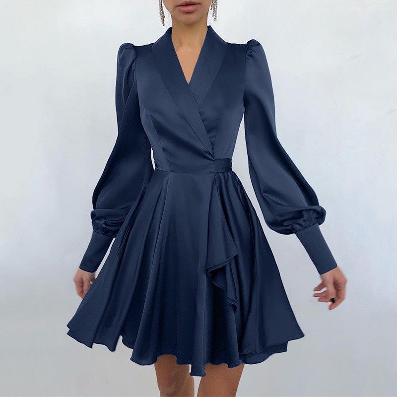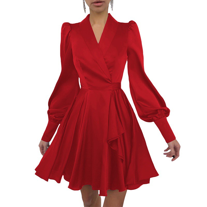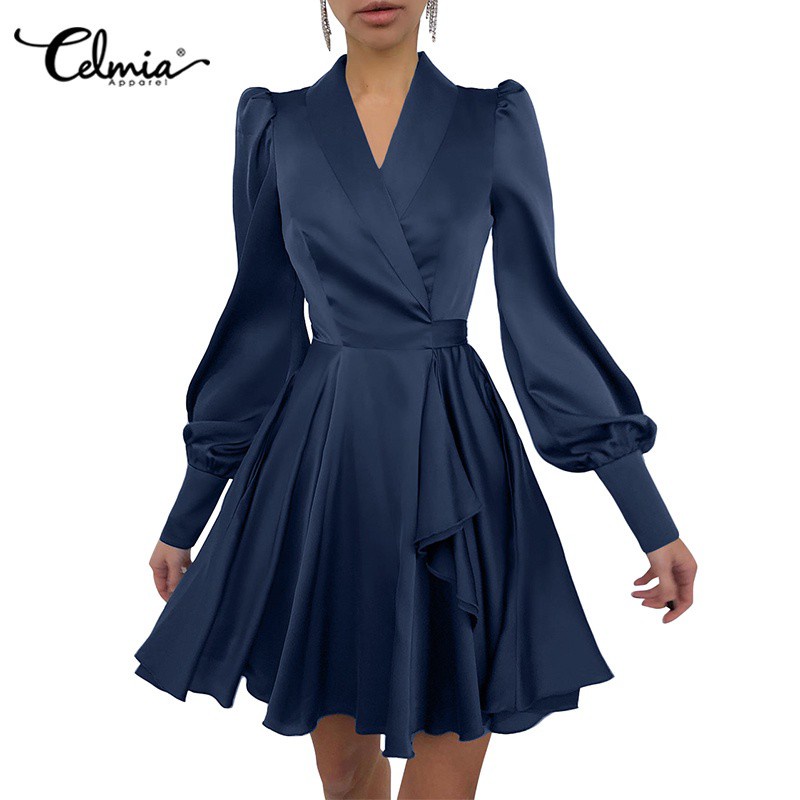 Celmia Women Satin Silk Puff Long Sleeve Lapel Fashion Party Mini Dress