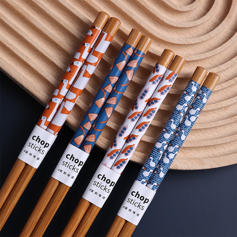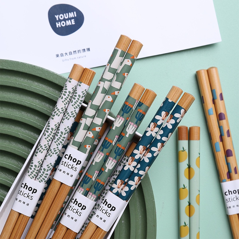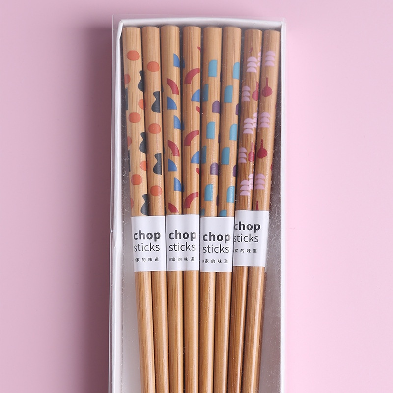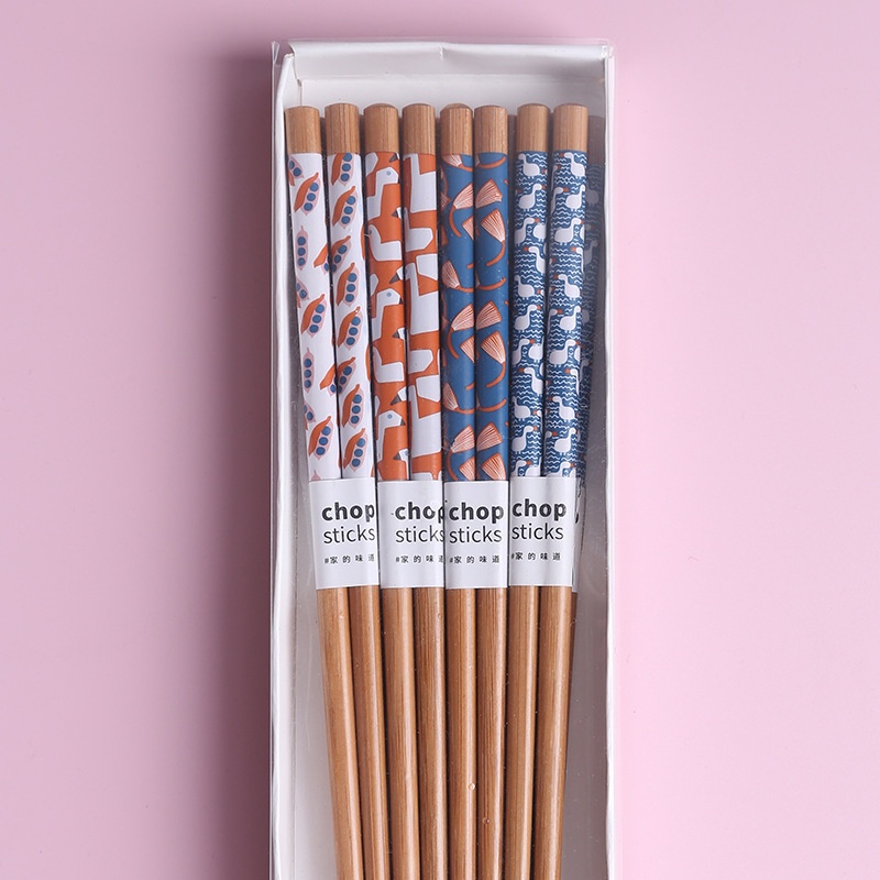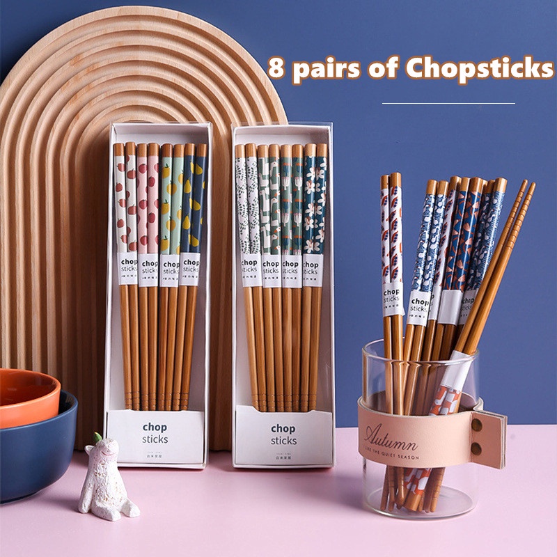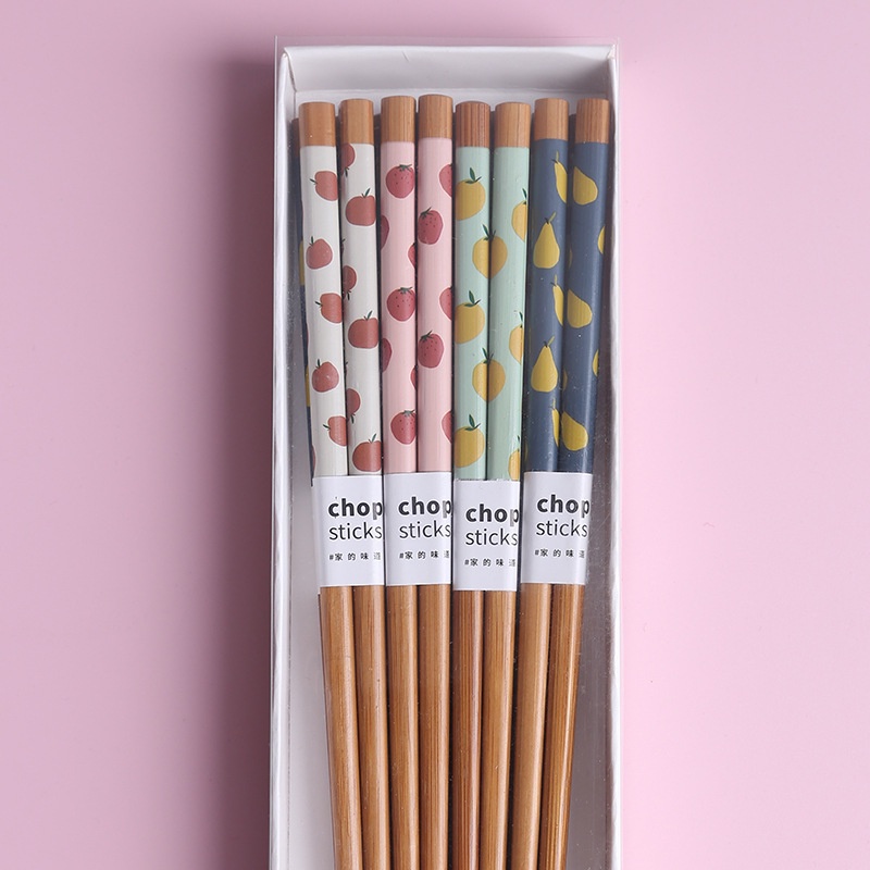 8 pairs of Chopsticks Home Family Anti-Mildew Bamboo Printed Fruit Chopsticks Japanese Style Cutlery Set with Gift Box