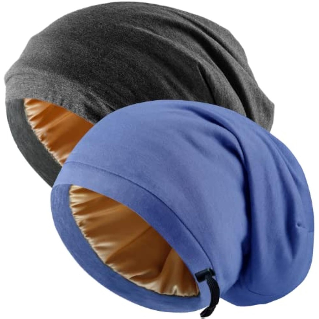 Silk Satin Bonnet Hair Wrap for Sleeping, 2 Pcs Adjustable Silk Bonnets for Women Men Sleep Cap Silk Lined Slouchy with Adjustable Strap Curly Hair Head Scarf Night Caps