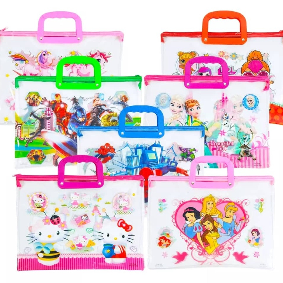 Character design transparent long zipper plastic envelope with handle for kids school supplies bag