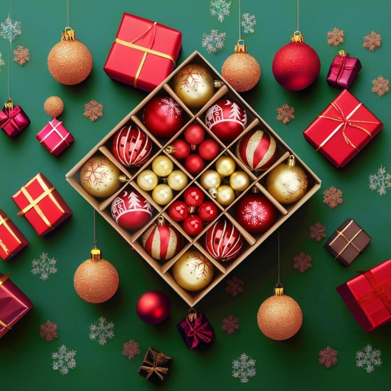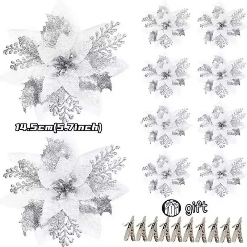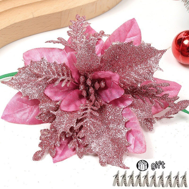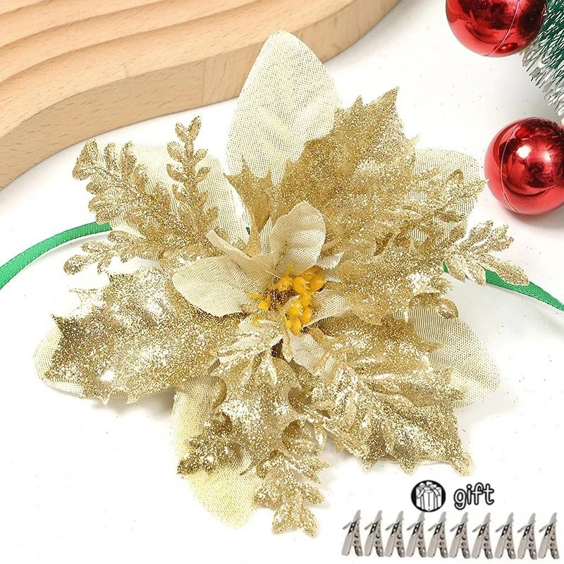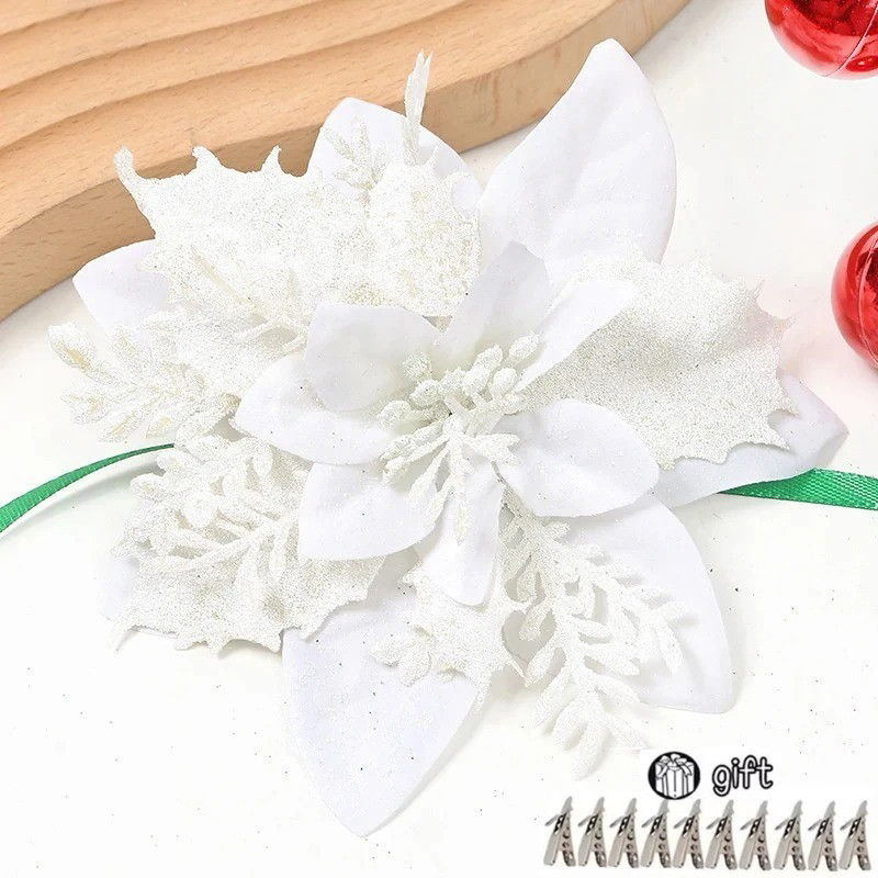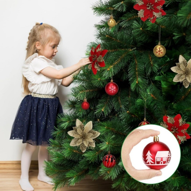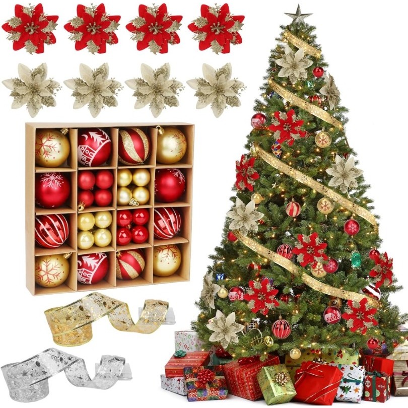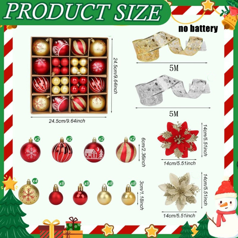 Christmas Tree Decortion Set Christmas Balls Glowing Ribbon Light Flower Ornament Set Christmas Tree Ribbon Poinsettia Flower for DIY Xmas Wreath Holiday Home Party Decor