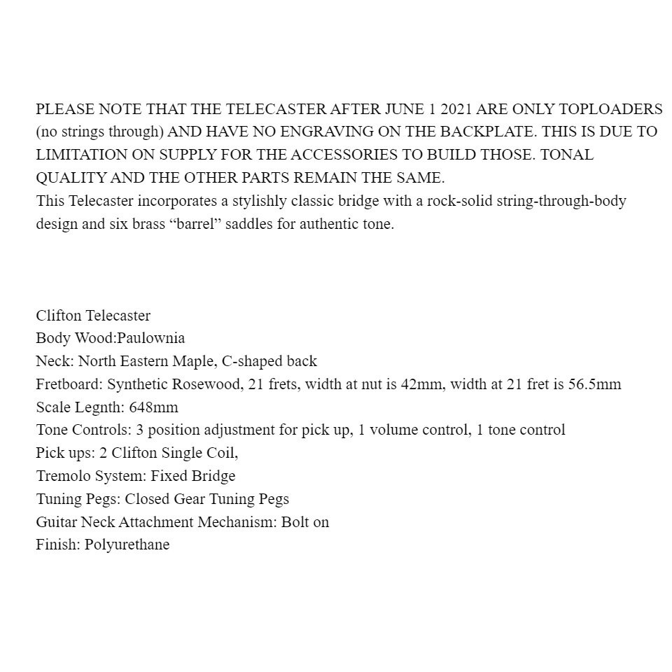 Clifton Vintage Custom Telecaster Single Coil Pickups Electric Guitar